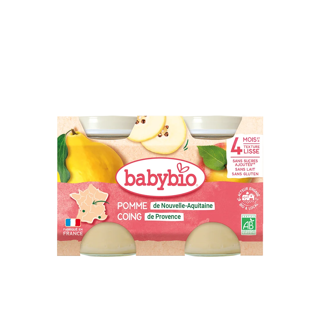 Pommes de Nouvelle-Aquitaine* 73%, purée de coings de Provence* 27% (coings*, eau).
