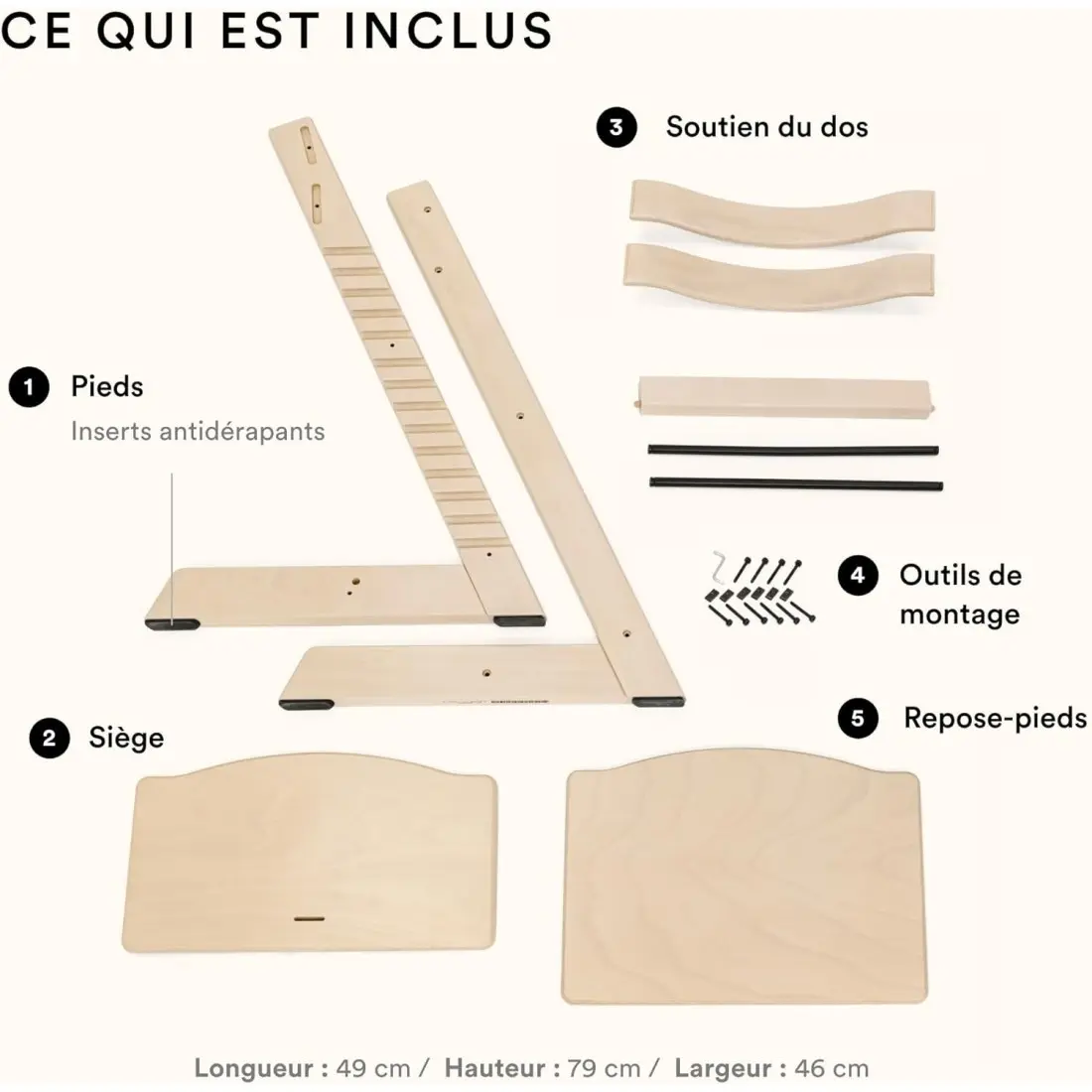 - Qualité et Sécurité : La chaise Tripp Trapp est fabriquée en bois de hêtre massif et peut supporter jusqu'à 136 kg, assurant une utilisation durable et sécurisée pour toute la famille.