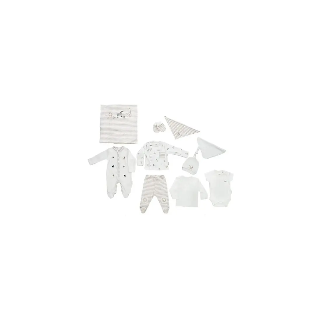 Coffret naissance 100% coton 10 pièces Jungle. Qualité premium et design cute. Idéal pour un cadeau naissance. Taille : 0-3 mois.