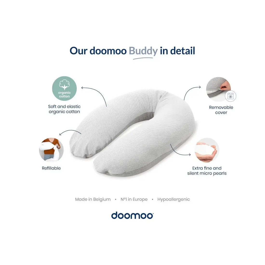 Doomoo propose ce coussin de maternité super doux, souple et rechargeable. Les housses pour le coussin d'allaitement sont également disponibles.