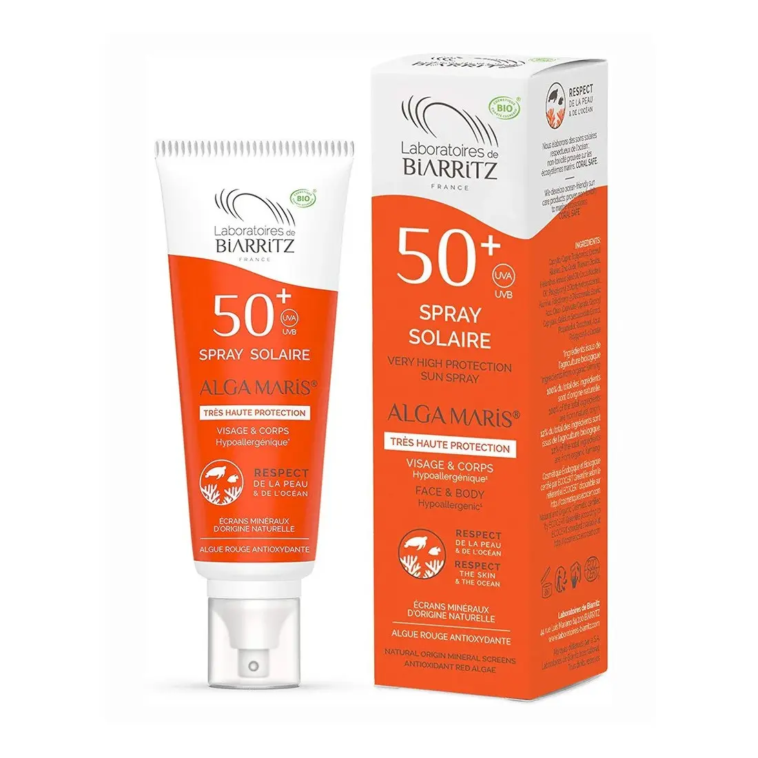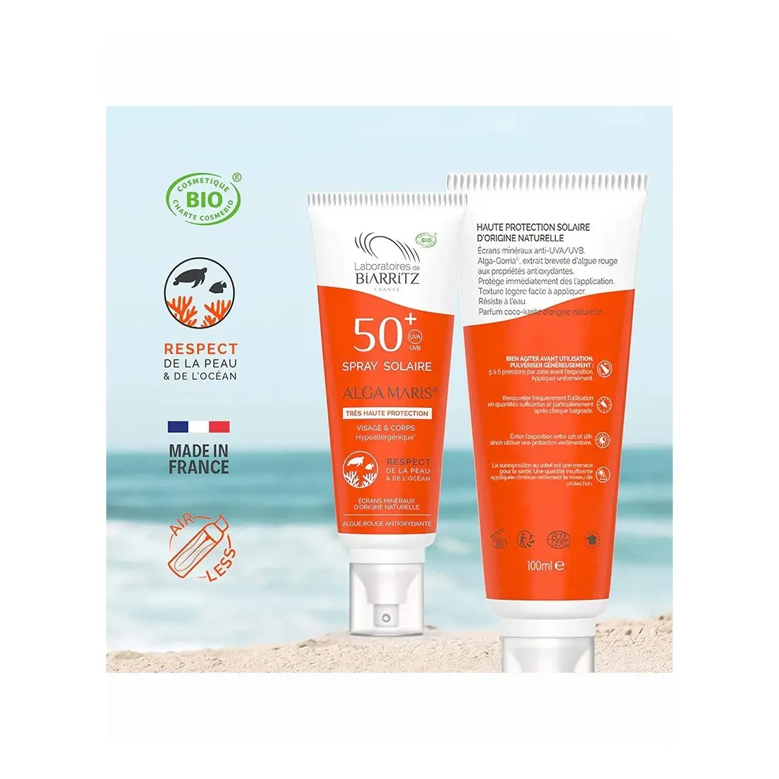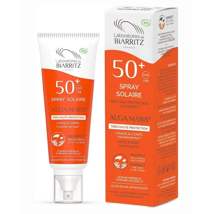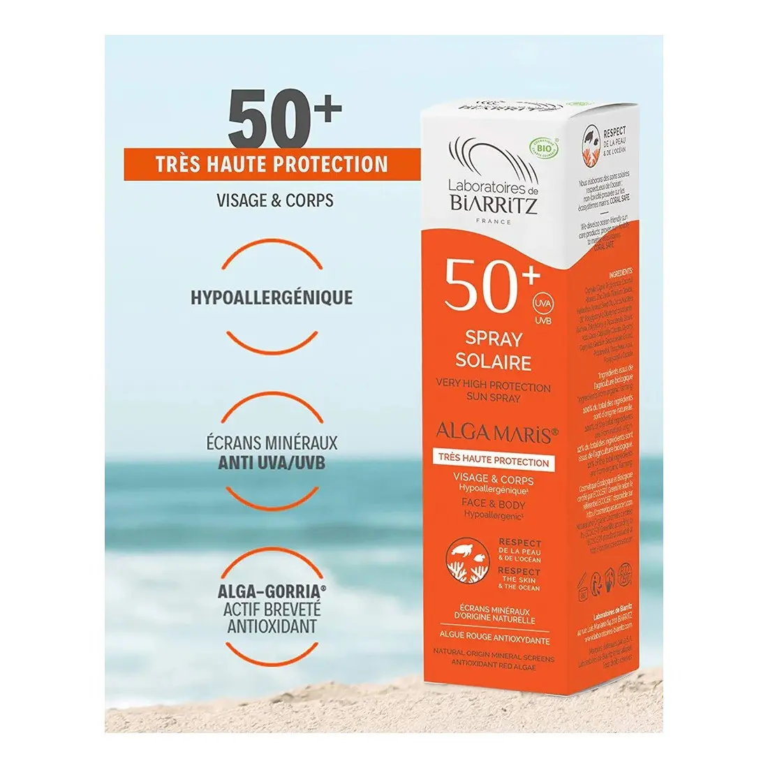 Le spray solaire SPF50+ protège immédiatement des rayonnements UVA/UVB grâce à l'association unique d'écrans minéraux et d'Alga-Gorria®, un extrait antioxydant breveté d'algue rouge issue de la côte basque, qui prévient notamment le vieillissement cutané.