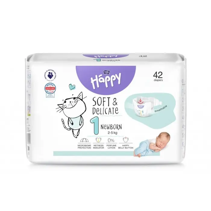 Les couches bébé Happy assurent une sensation de garde au sec et un confort exceptionnel permettant le développement des petits sans soucis. La haute qualité, la sécurité et le respect cutané assuré par les couches Happy ont été confirmées par des tests dermatologiques.