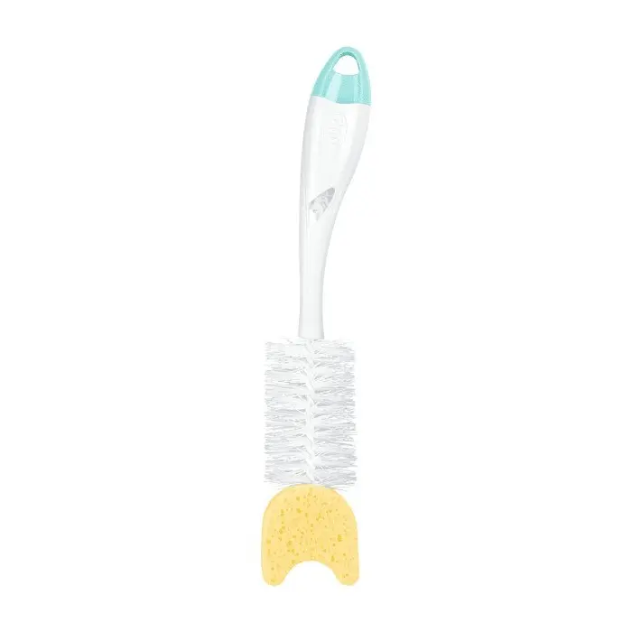 Le Goupillon 2en1 Avec Embout Eponge de NUK est dotée d'en éponge naturelle résistante, qui peut atteindre tous les recoins du biberon et assurer un nettoyage efficace.