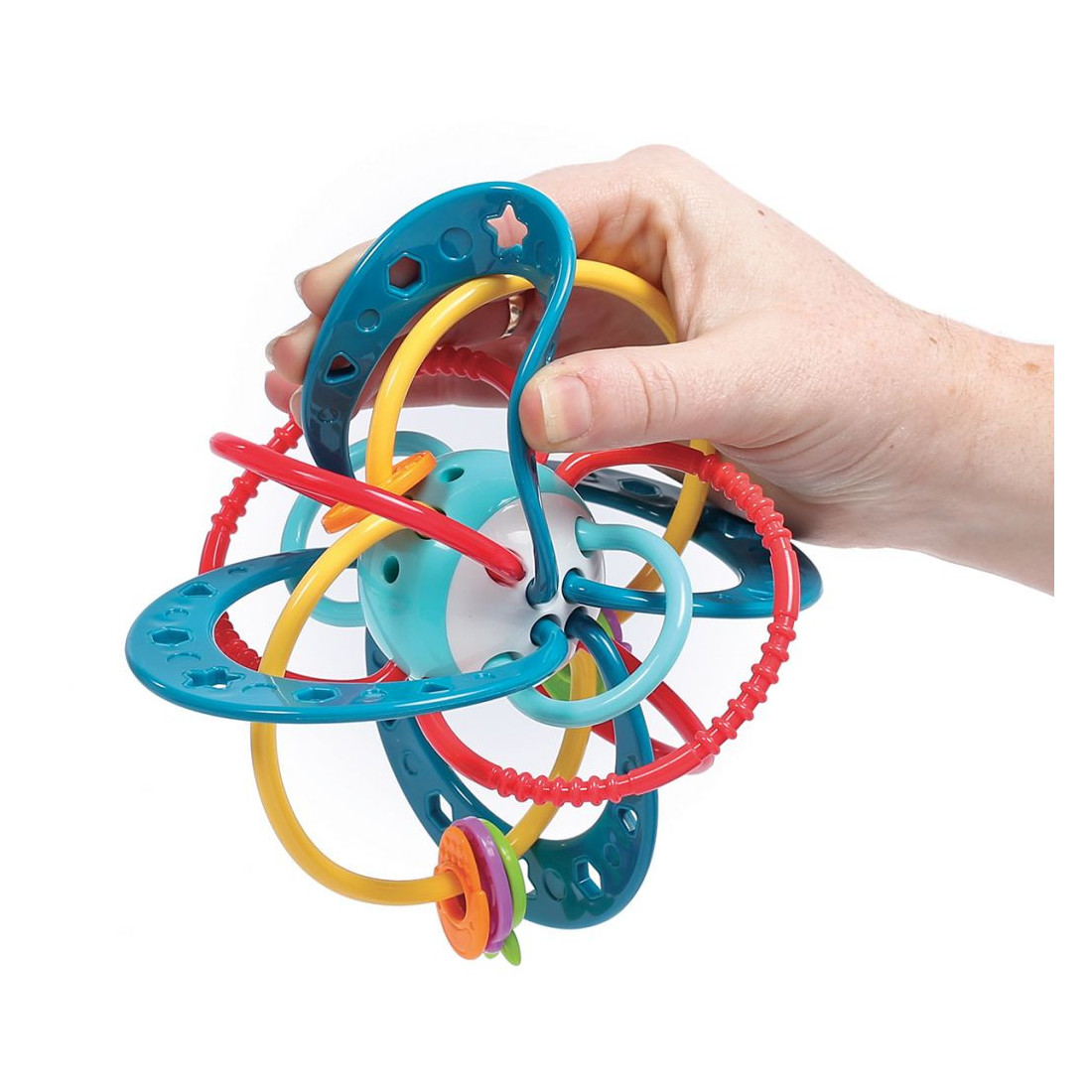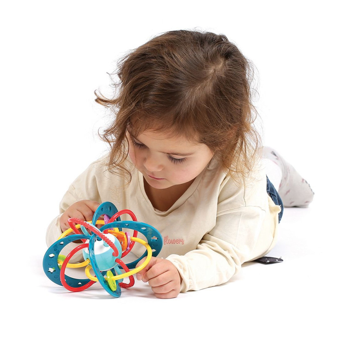 Avec tous ses tuyaux, le hochet planète est très facile à prendre en main par les tout-petits. Ses couleurs vives et sa forme originale attire l’attention ! Les enfants ne peuvent résister à l’attraper pour la manipuler dans tous les sens, écouter les petits bruits et à la contempler. Ses nombreux tuyaux souples sont de différentes tailles pour donner un volume rigolo à la balle.