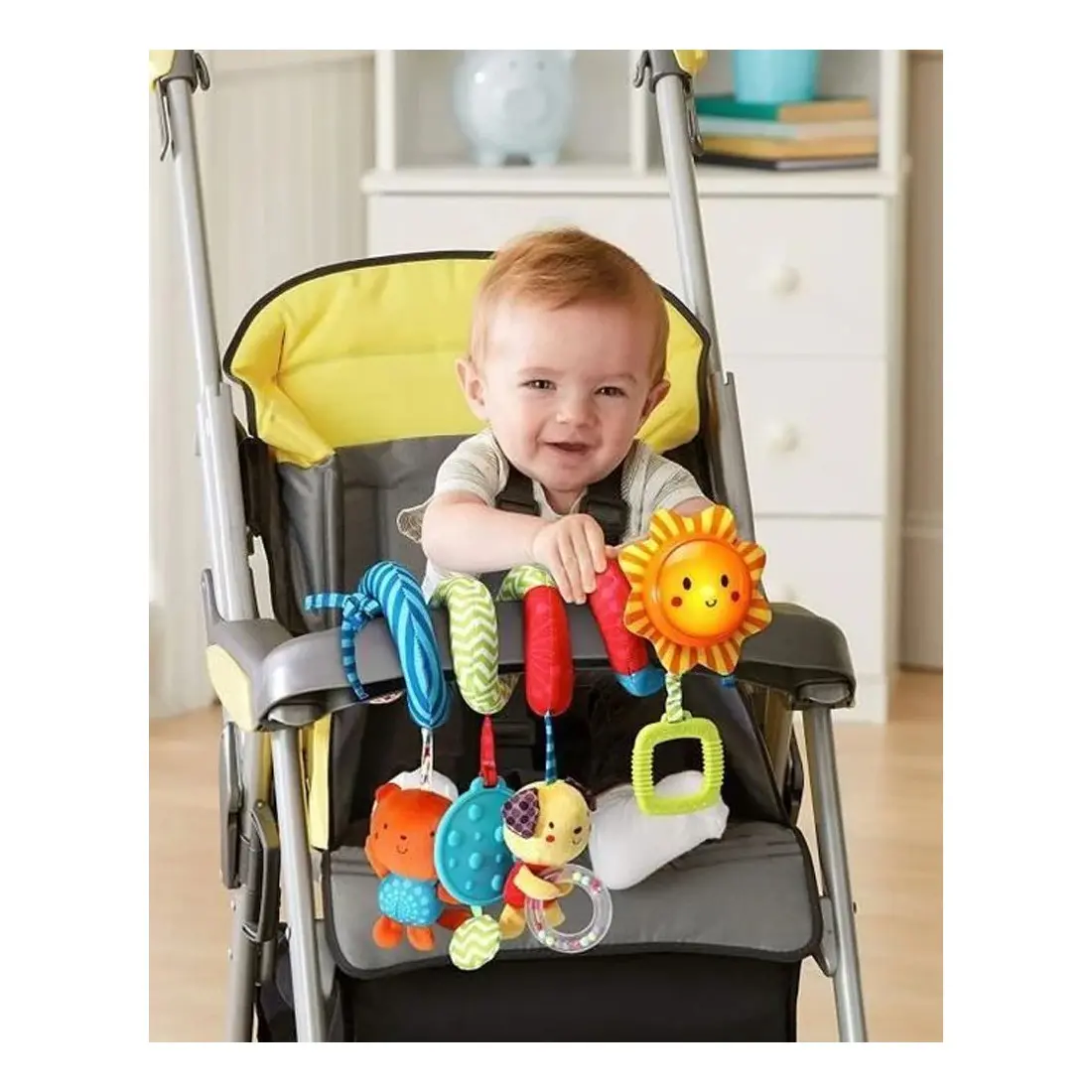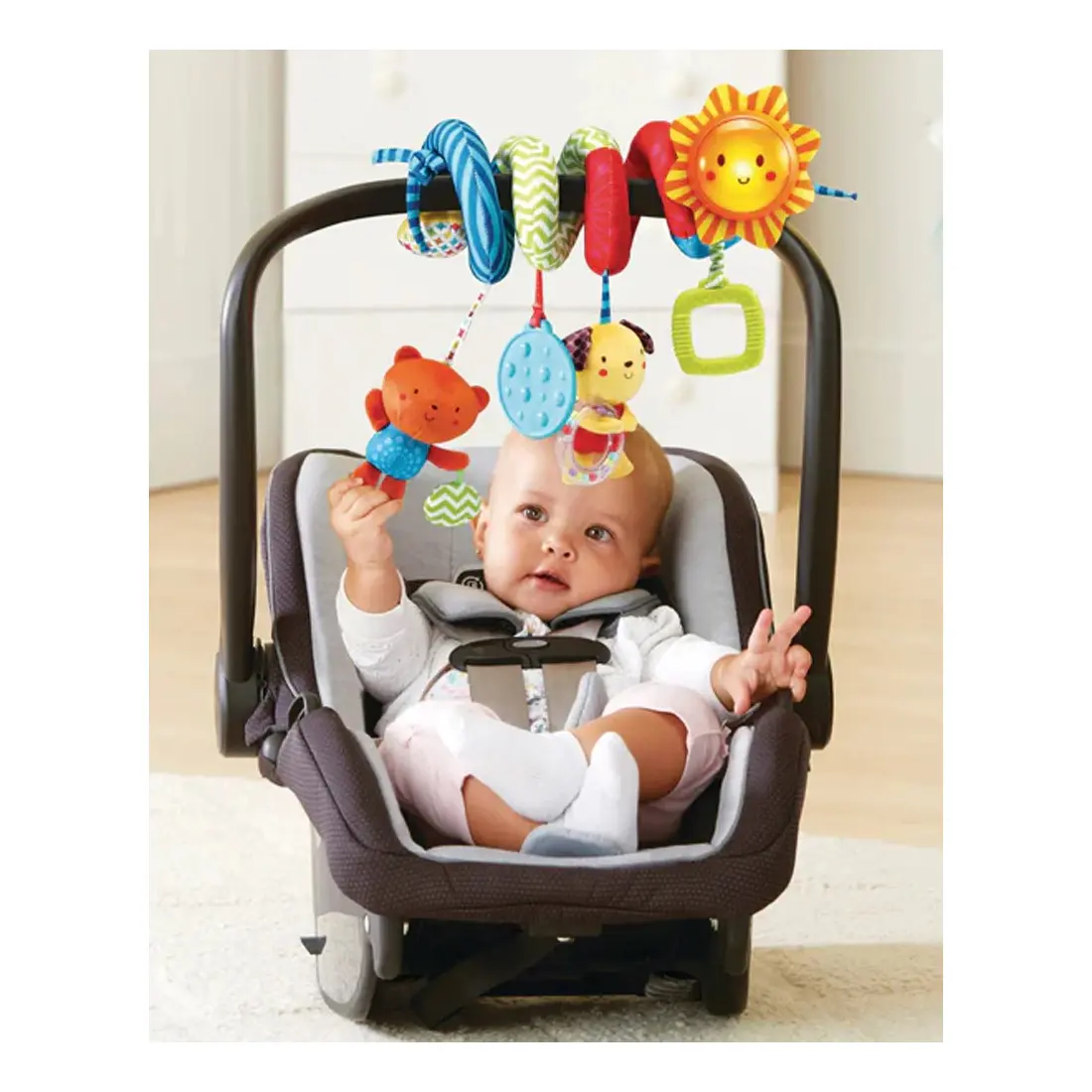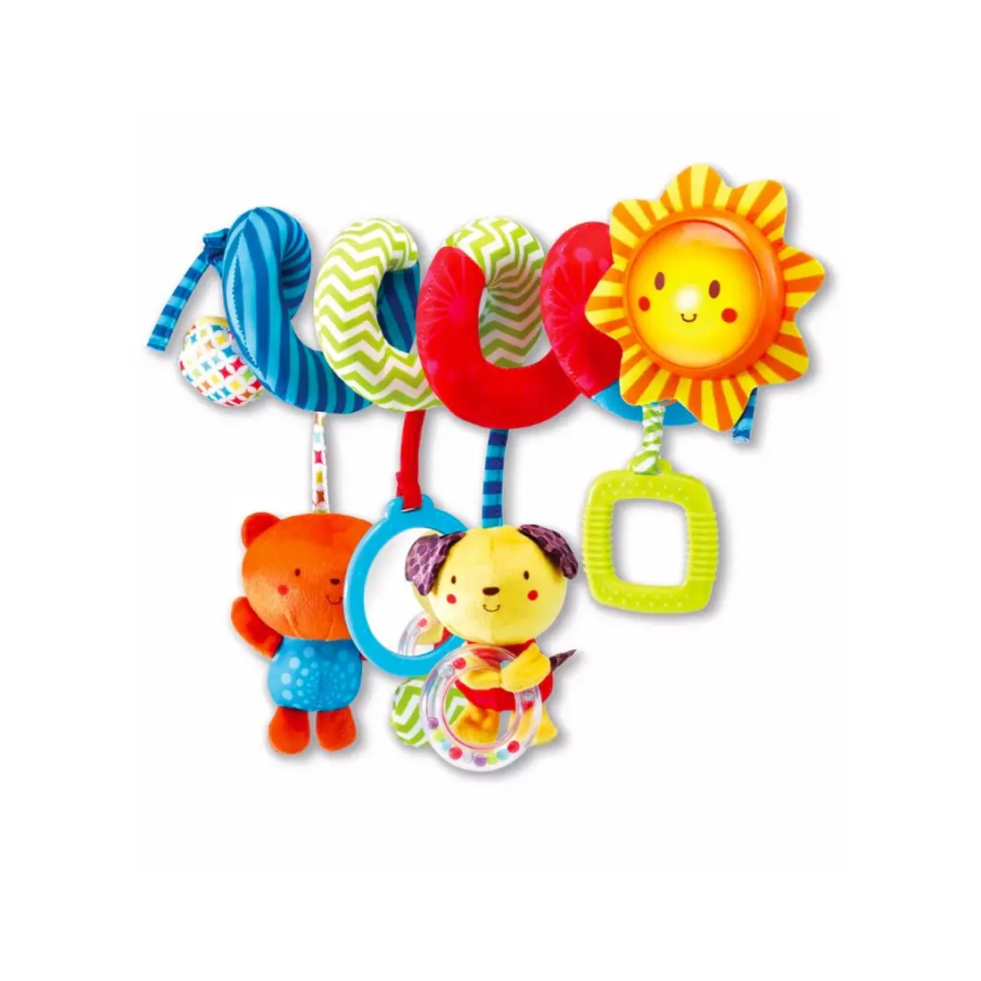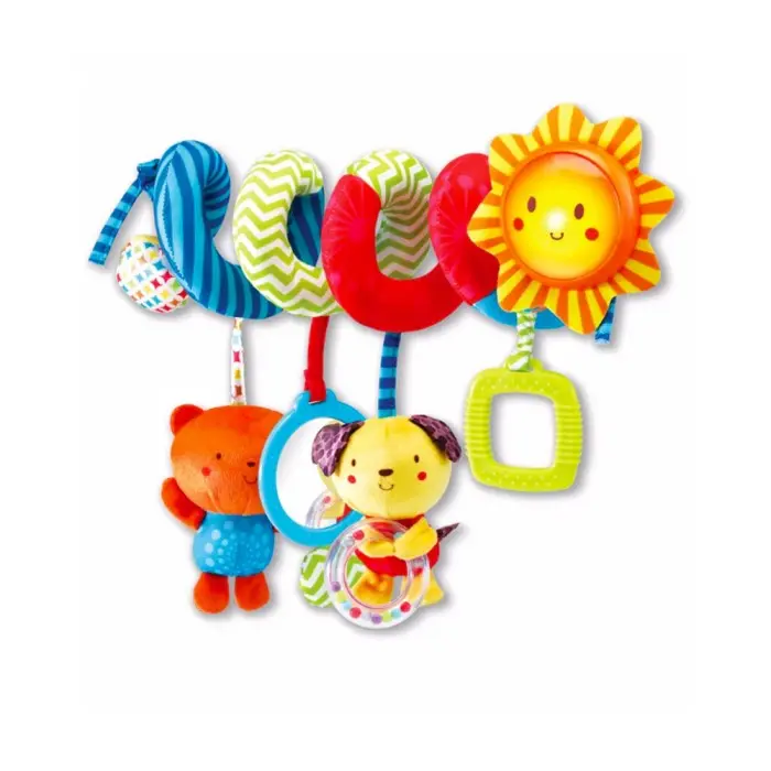 La spirale propose plusieurs éléments suspendus pour enrichir l’exploration sensorielle. La poignée interactive déclenche des effets sonores et lumineux lorsque bébé tire dessus, renforçant la relation cause à effet. Le hochet chien, avec ses petites billes mobiles, stimule l’ouïe et la motricité fine. Le hochet chat émet des sons amusants lorsqu’il est secoué, tandis que le hochet miroir permet à l’enfant de découvrir son reflet et de développer la conscience de soi.