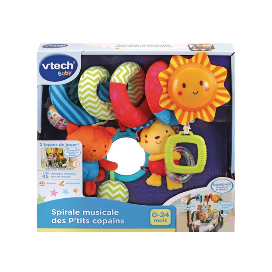 La spirale musicale des P’tits Copains VTech 0-24 mois est un jouet d’éveil complet conçu pour accompagner bébé dès la naissance lors de ses déplacements. Facile à fixer sur l’anse d’une poussette ou sur un siège auto à coque, elle stimule les sens et favorise le développement sensoriel tout au long des promenades.