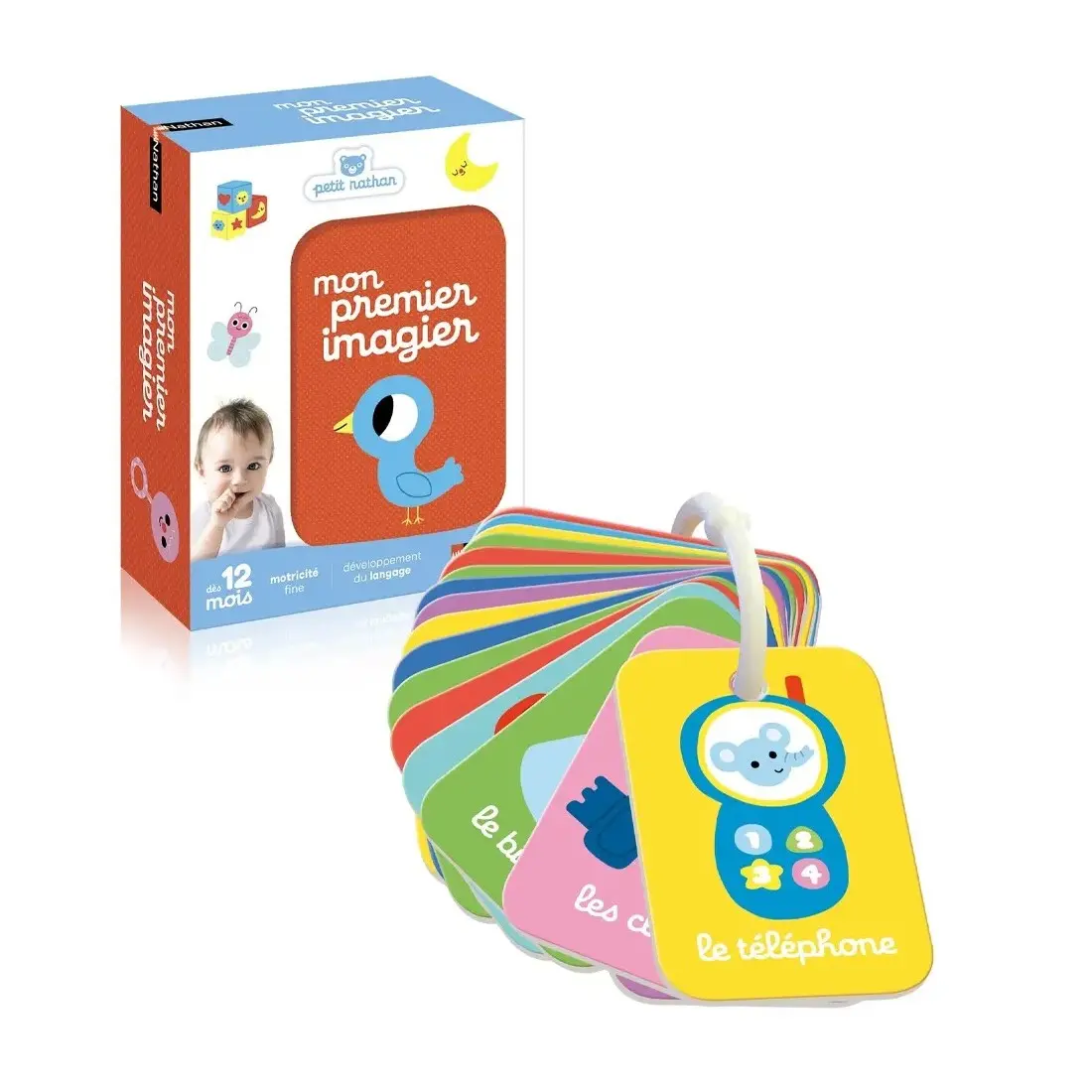 Mon Premier Imagier de Nathan est un jeu éducatif conçu pour aider les enfants dès 12 mois à découvrir les premiers mots du quotidien. Composé de 20 cartes recto-verso reliées par un anneau en plastique, cet imagier se manipule facilement comme un trousseau de clés, permettant à l’enfant d’apprendre en jouant et en observant les illustrations colorées.