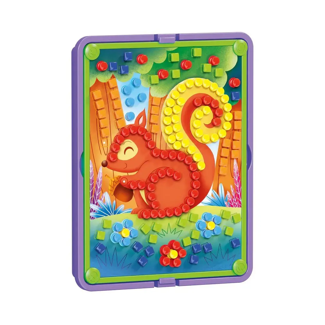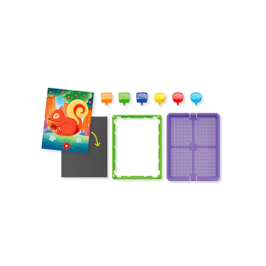 Insérez les épingles colorées dans les fiches illustrées et créez des mosaïques spectaculaires. Utilisez le panier pratique pour tout ranger après avoir joué.
