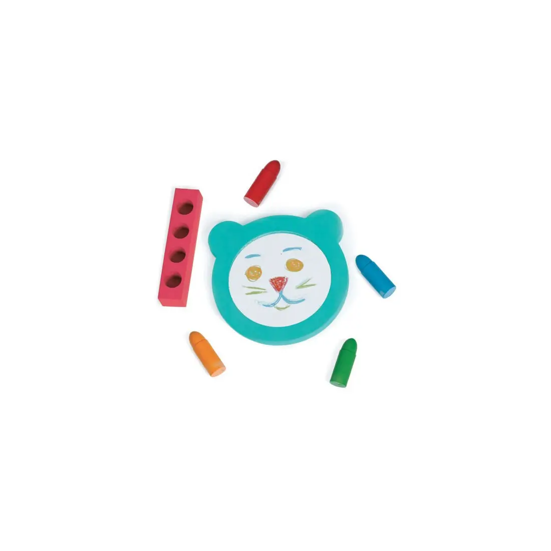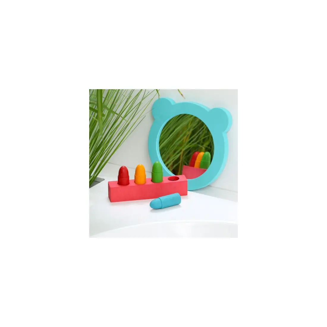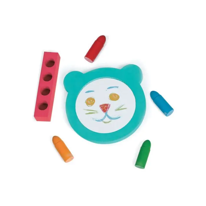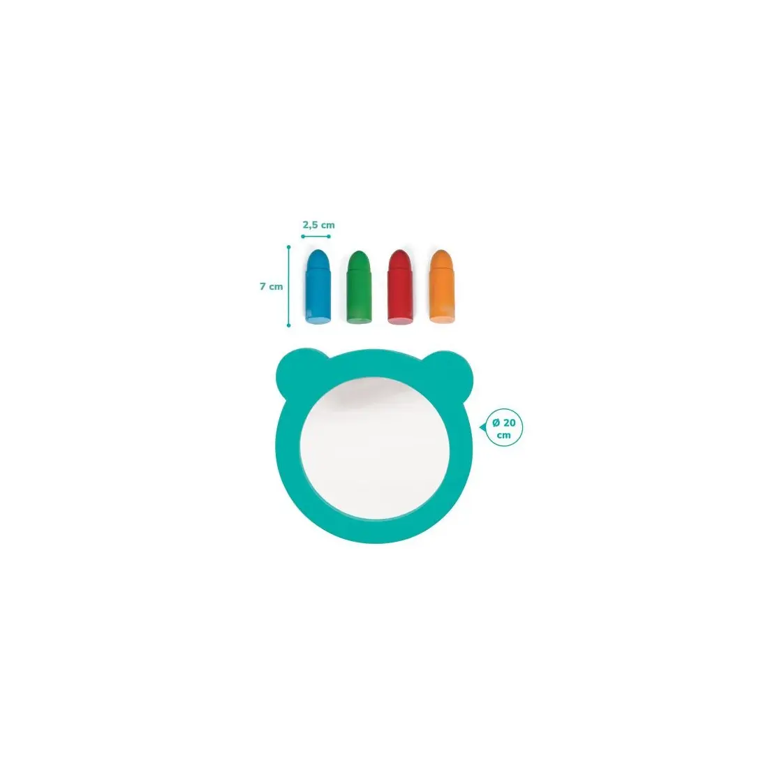 De bonne taille, les 4 crayons sont très faciles à prendre en main et aident au développement de la dextérité des enfants. Solides et résistants à l’eau, les enfants pourront les laisser tomber dans le bain sans craindre qu’ils ne fondent. Dimensions du miroir : Ø 20 cm. Dimensions des crayons : 7 x 2,5 cm.