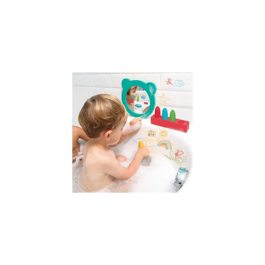 C'est un super coffret de bain à offrir à votre bébé, comprenant un grand miroir flotteur (collant aux parois du bain) et 4 crayons effaçables, solides et résistants à l’eau.