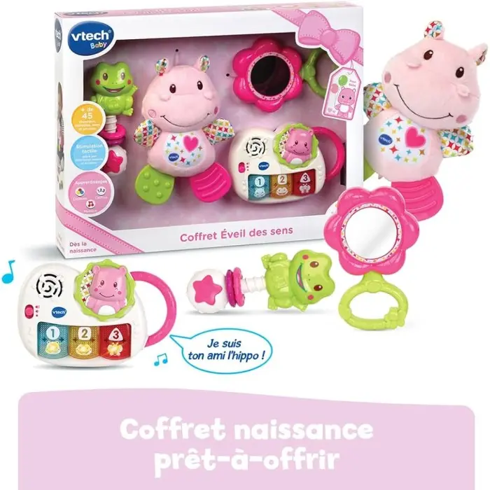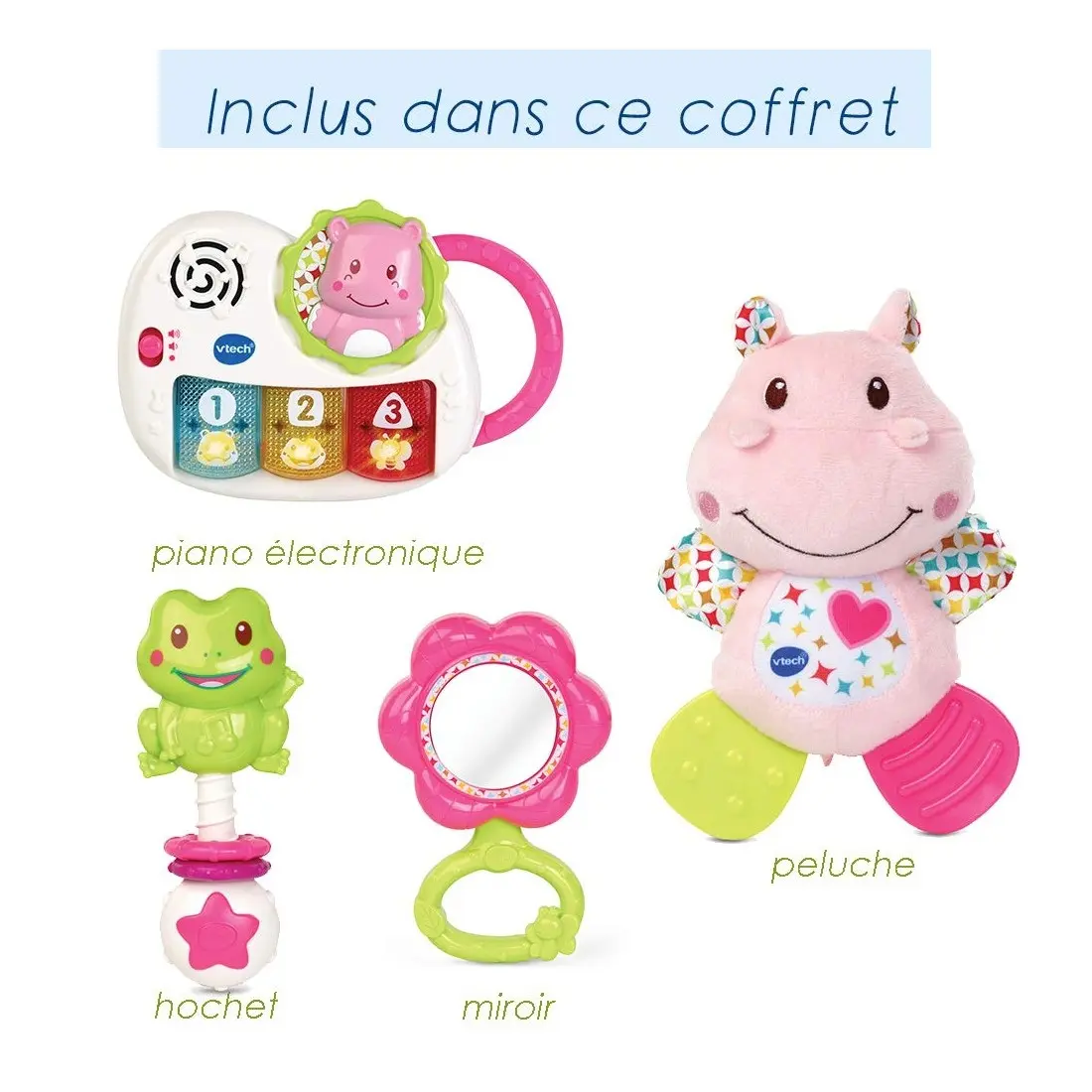 Le Coffret Éveil des sens est composé d'un hippo en peluche tout doux, d'un piano avec sons et lumières, d'un miroir en forme de fleur et d'un hochet grenouille.