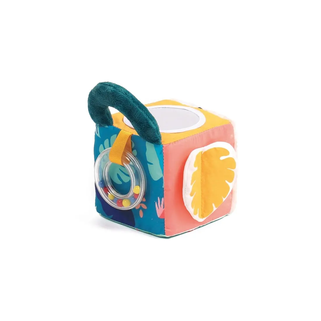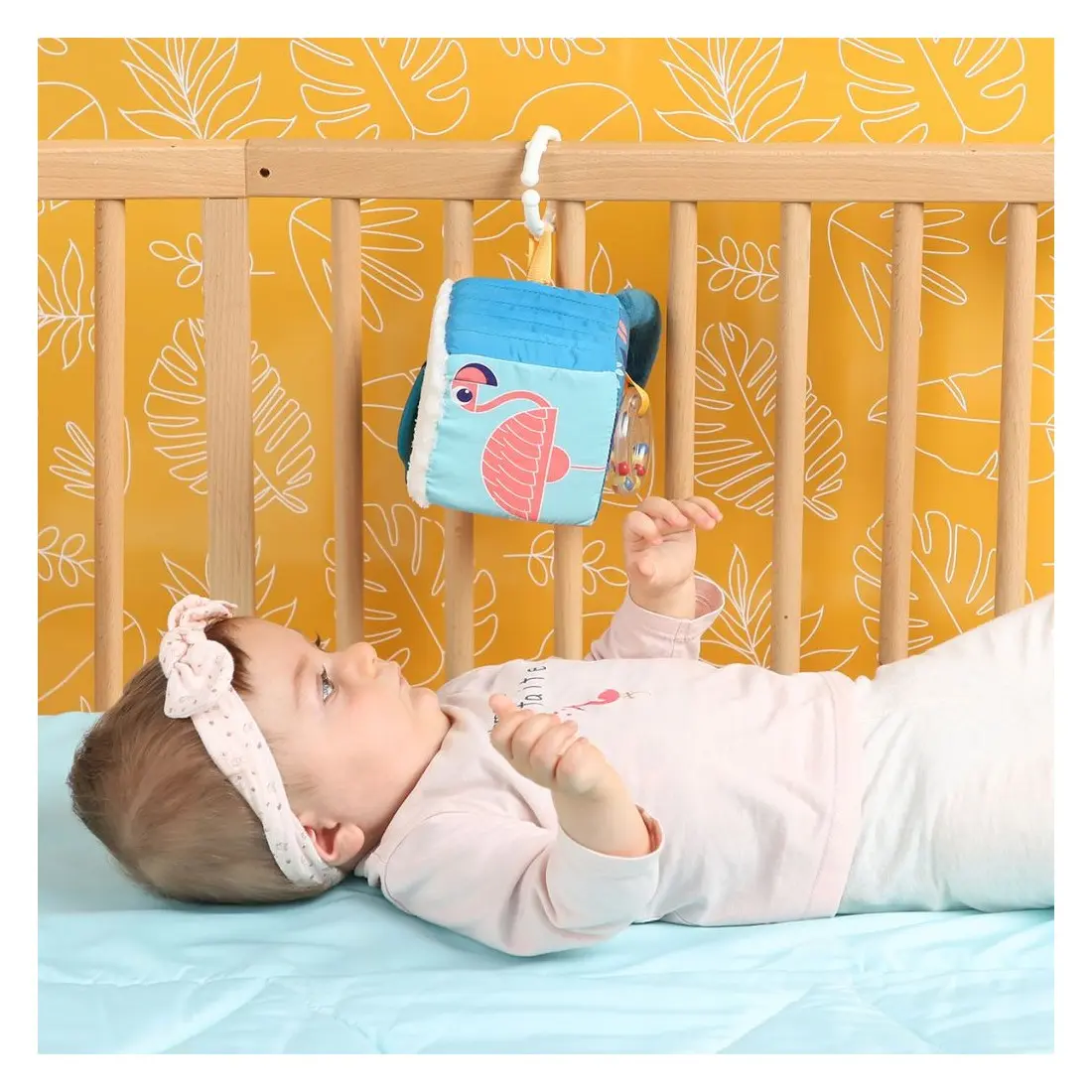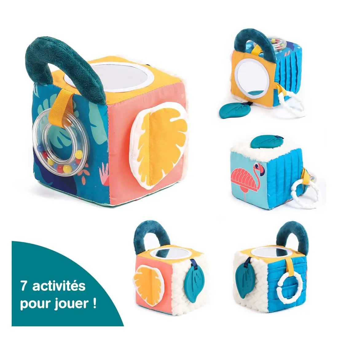 Sur les faces du cubes, bébé pourra s’admirer dans un petit miroir, caresser un joli tissu doux minky en vagues, gratter un tissu plissé, manipuler le papier bruissant de la feuille et découvrir le rigolo flamant rose.