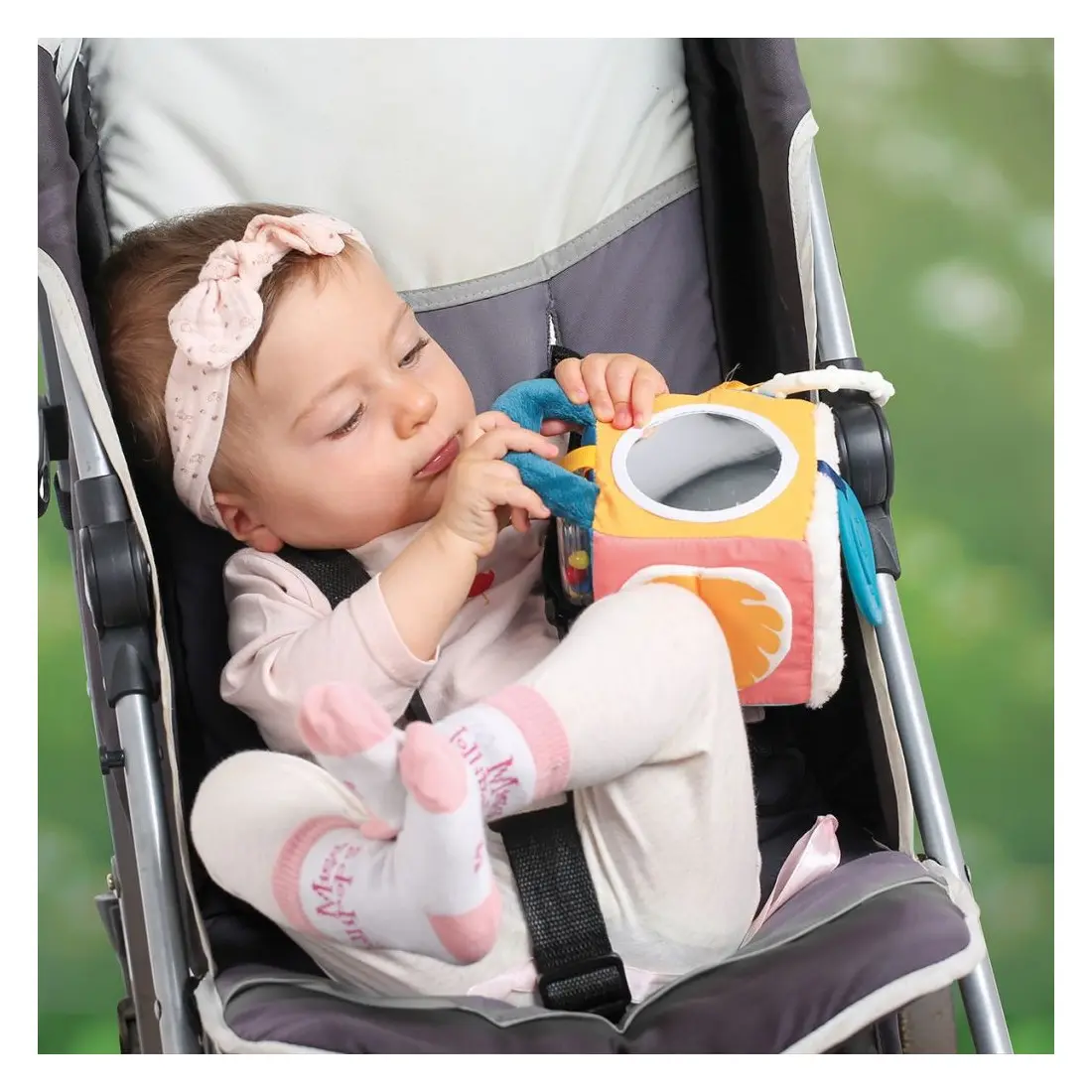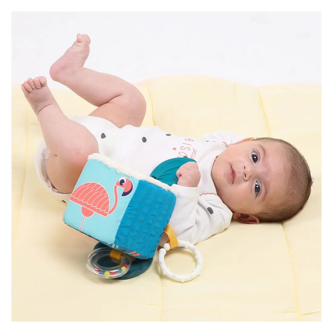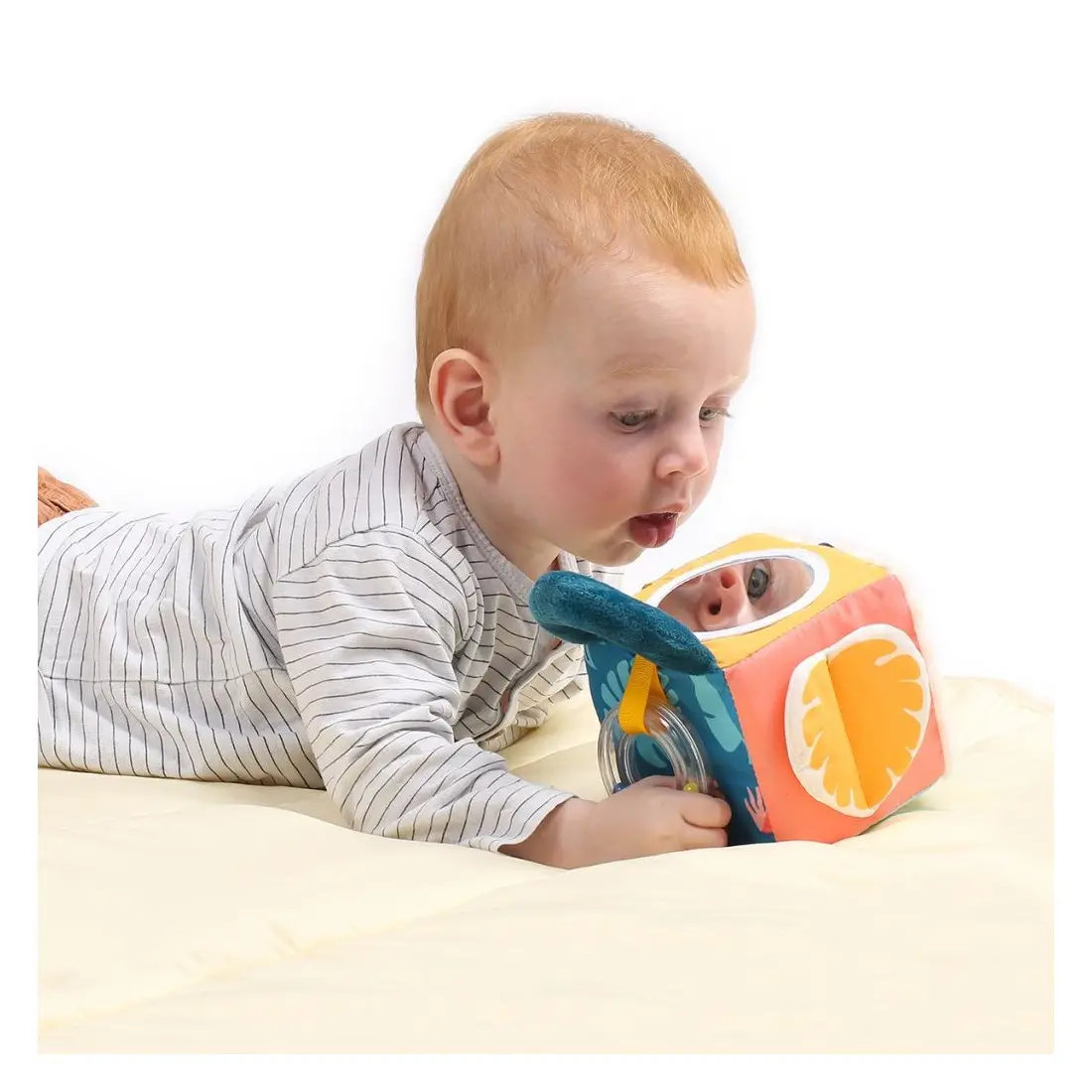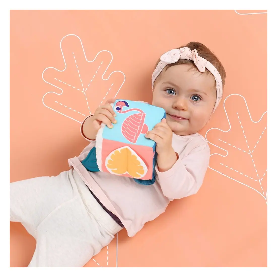 Sur les faces du cubes, bébé pourra s’admirer dans un petit miroir, caresser un joli tissu doux minky en vagues, gratter un tissu plissé, manipuler le papier bruissant de la feuille et découvrir le rigolo flamant rose.
