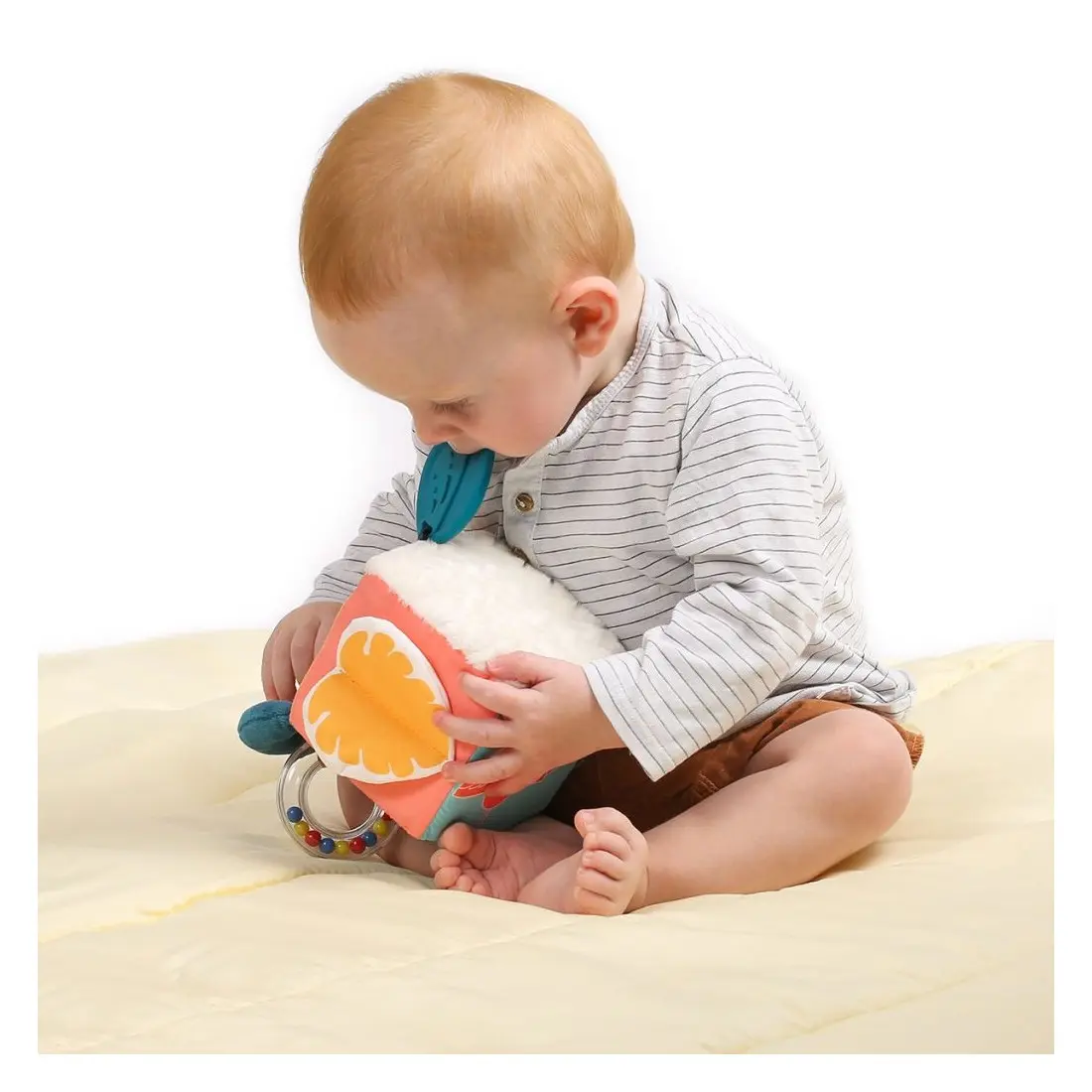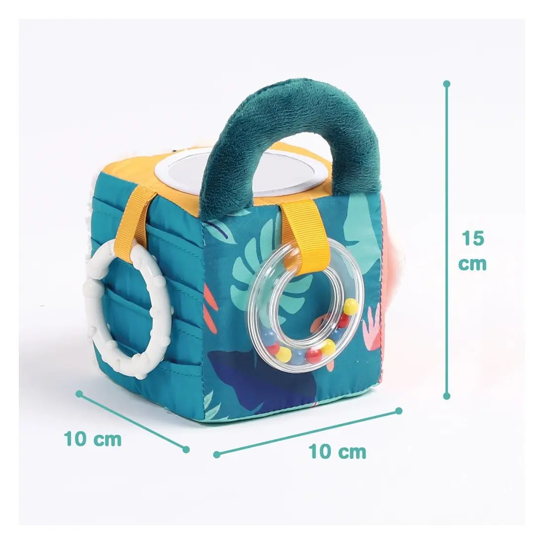 Découvrez également un anneau transparent avec des petites billes colorées, un hochet en forme de feuille (plastique doux à mordiller) et un anneau de dentition plus rigide. Ce dernier vous permet d’accrocher facilement le cube à la poussette, au siège-auto et au lit à barreaux.