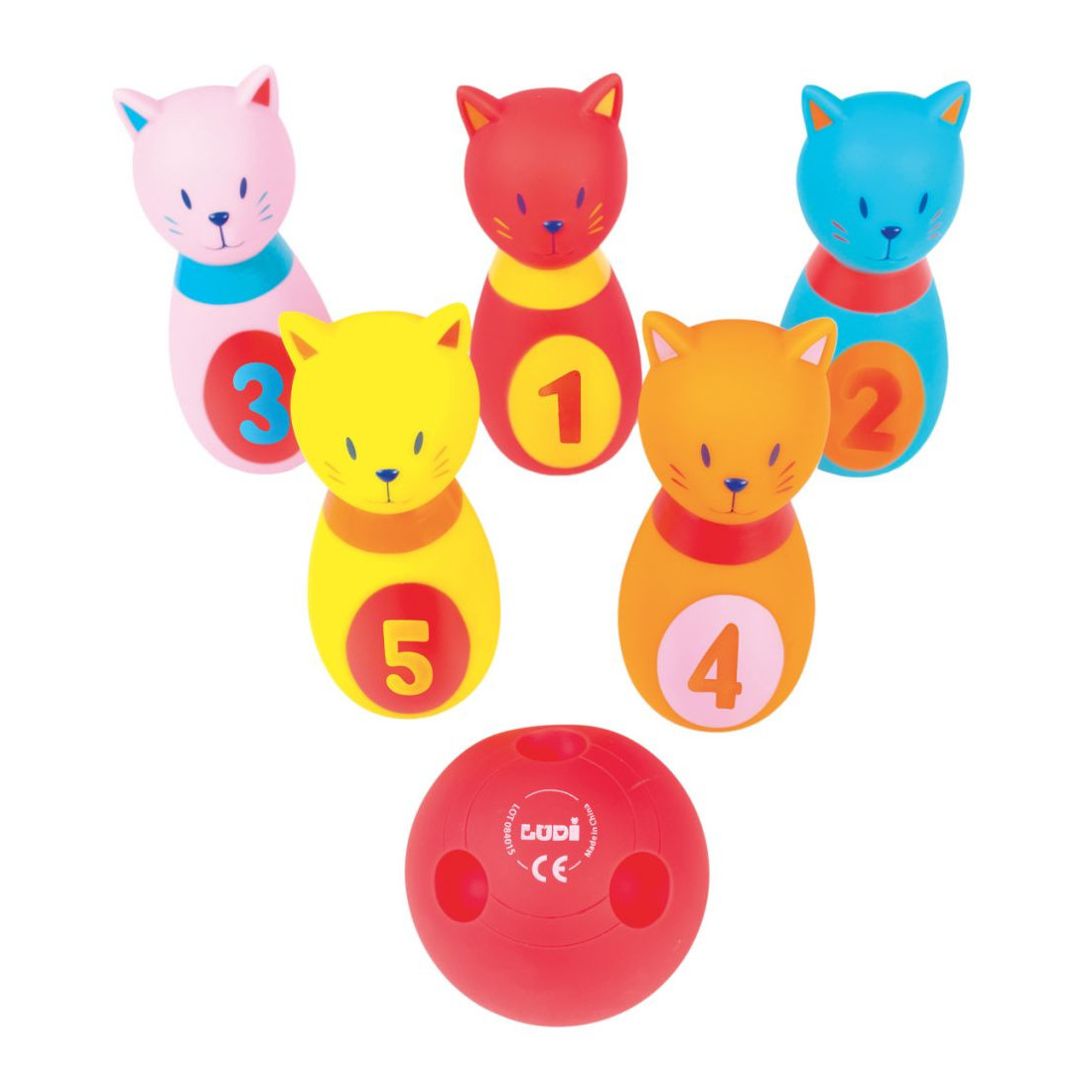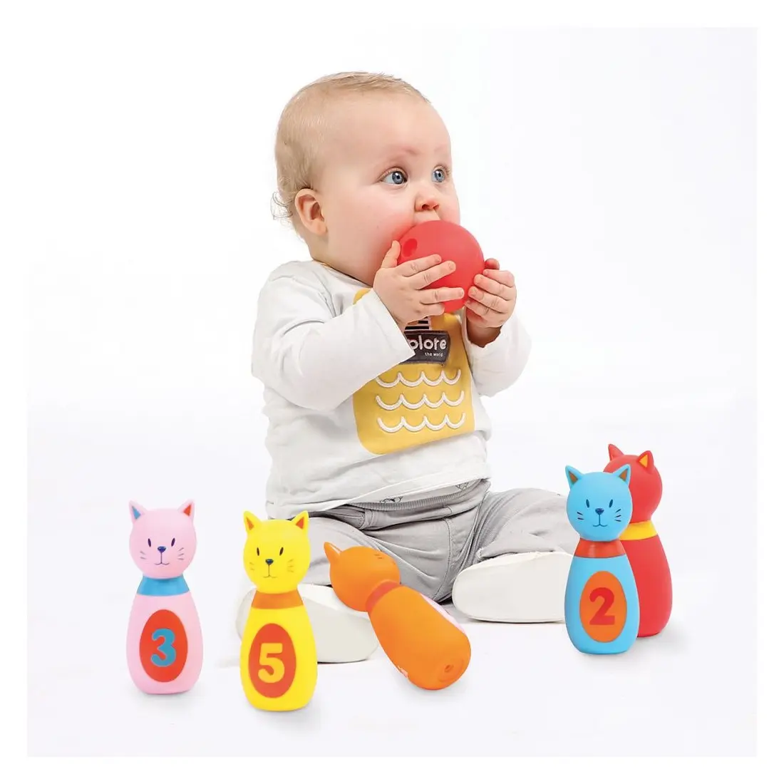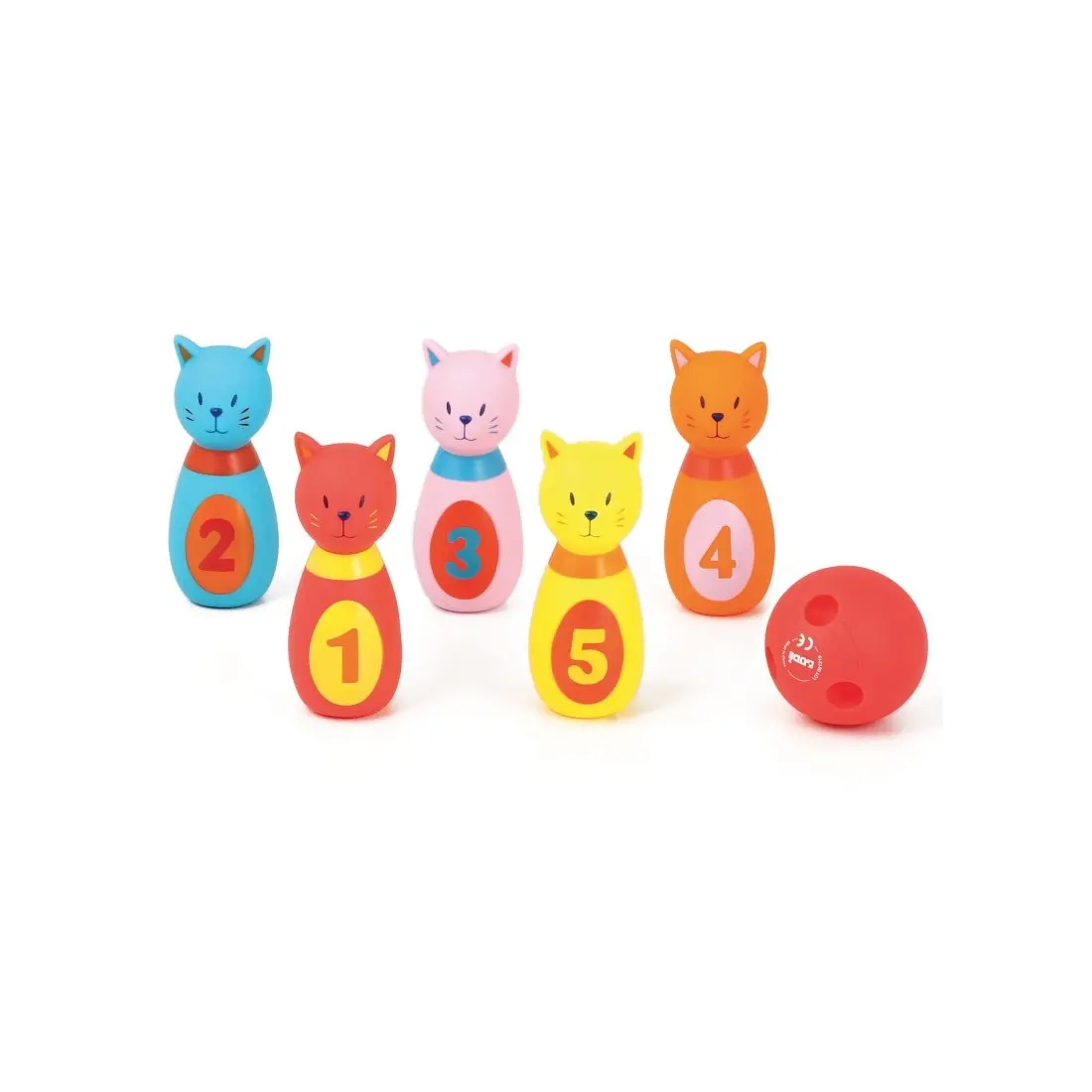 Cette jolie petite portée de chatons est réalisée en plastique souple. Elle offre une texture agréable au toucher et facilite la prise en main par les petits. Multicolores, les quilles attirent l’attention de Bébé et aident à la reconnaissance des couleurs. Le jeu de quilles, un incontournable chez les petits !