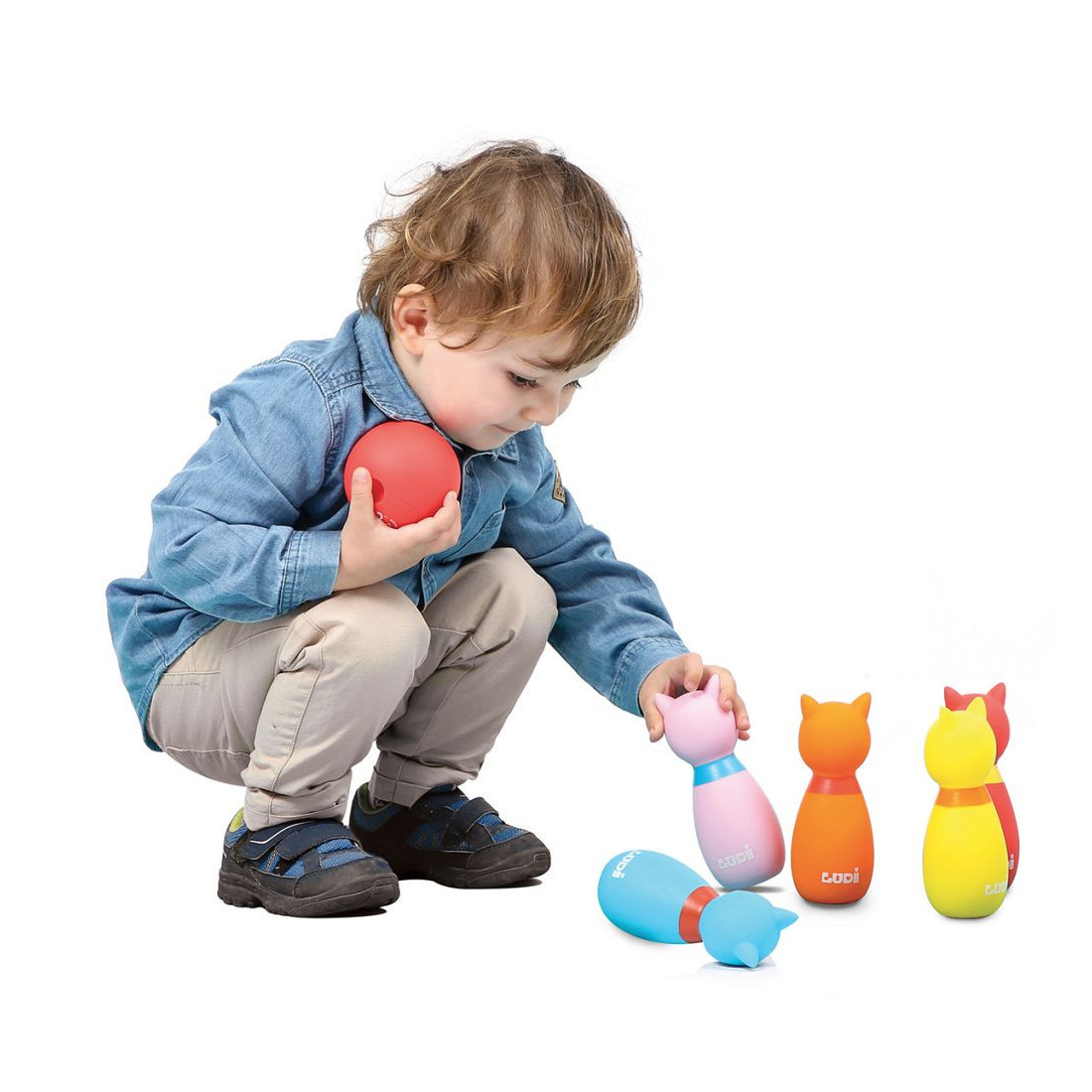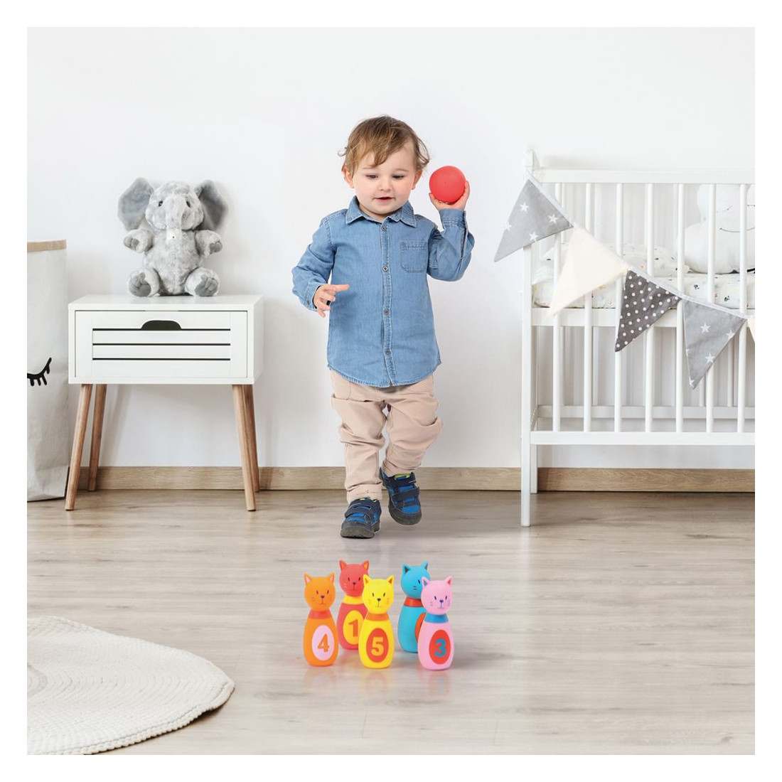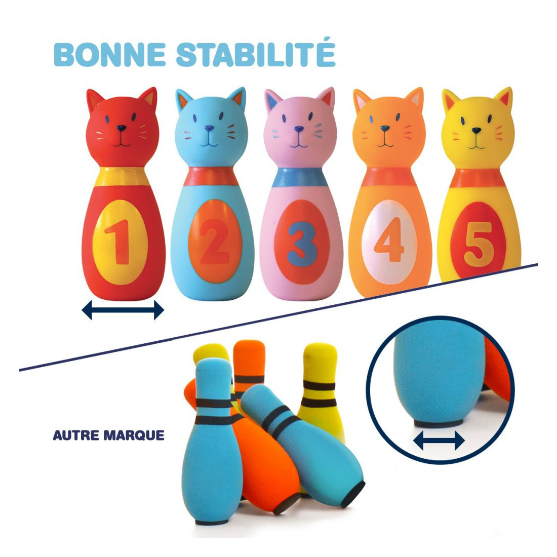 Cette jolie petite portée de chatons est réalisée en plastique souple. Elle offre une texture agréable au toucher et facilite la prise en main par les petits. Multicolores, les quilles attirent l’attention de Bébé et aident à la reconnaissance des couleurs. Le jeu de quilles, un incontournable chez les petits !