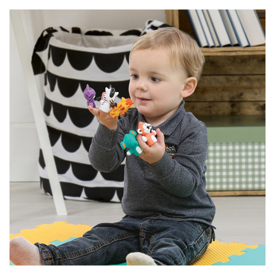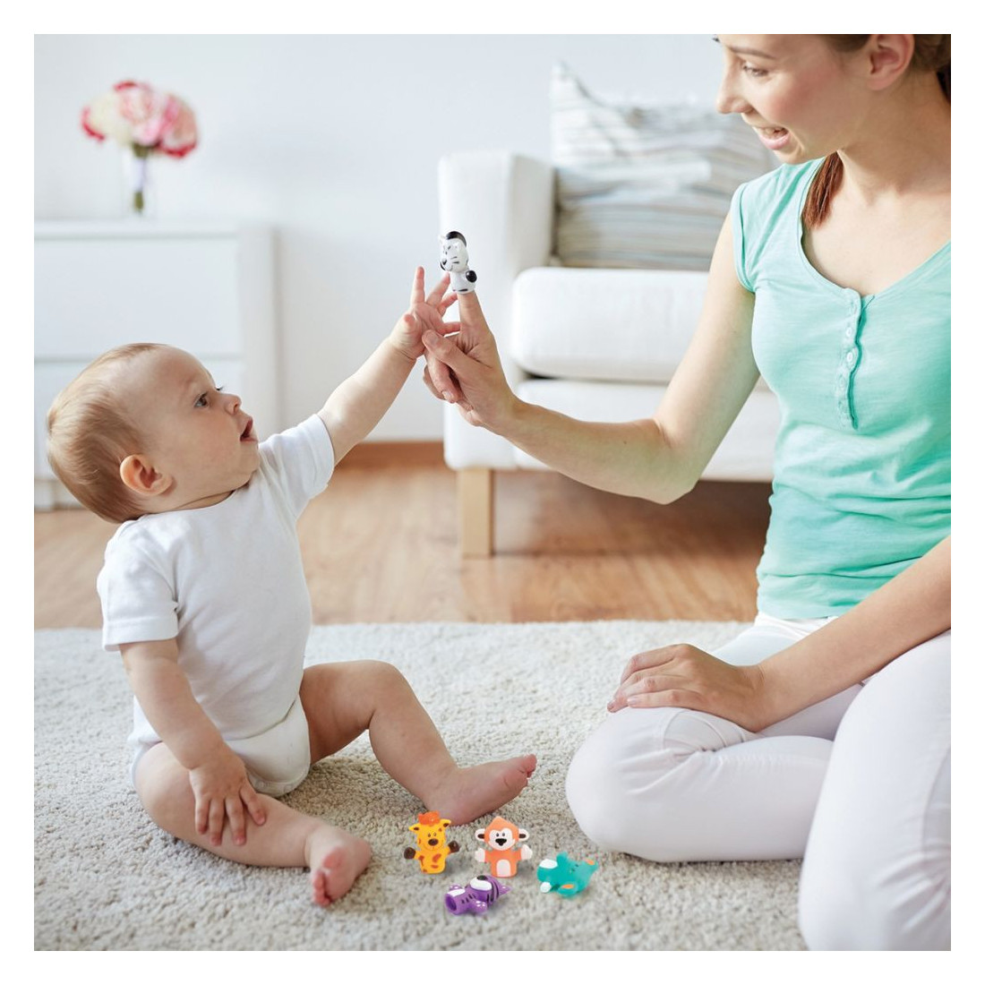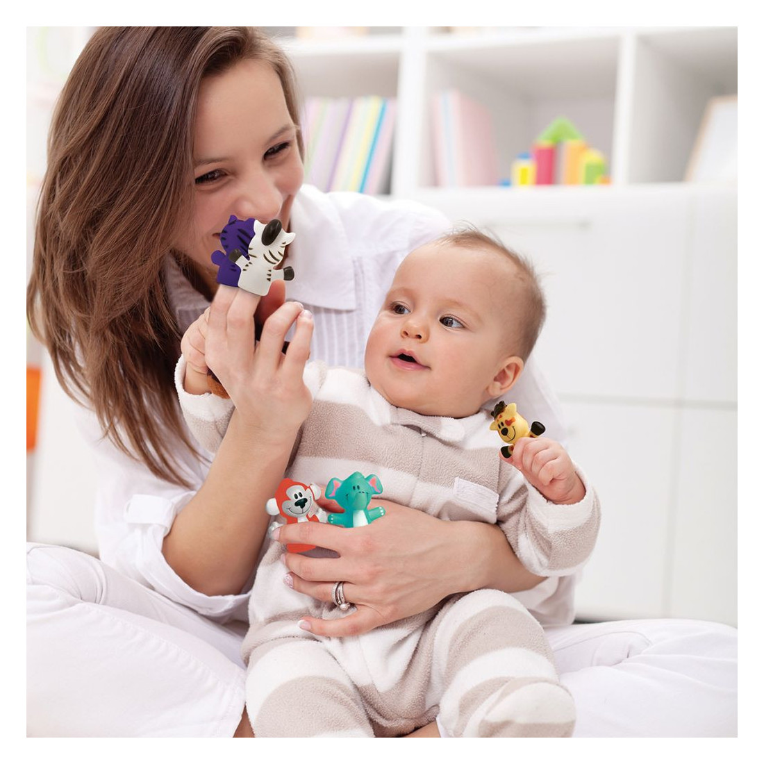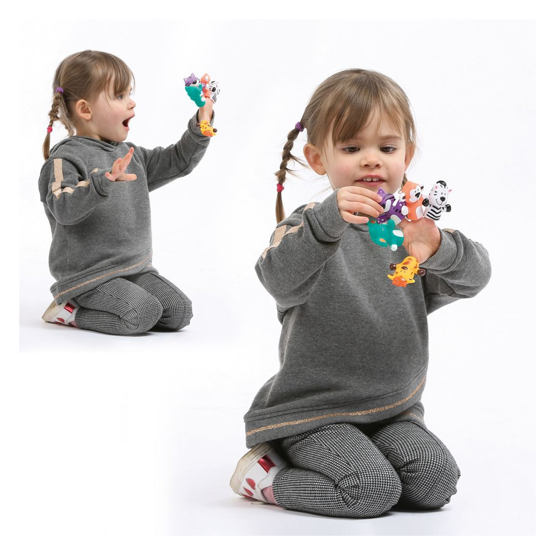 Ces jolis animaux, au design rigolo, sont spécialement conçus pour les petites mains. Réalisés en plastique doux, hygiénique et résistant aux mordillements ainsi qu’à l’eau, les marionnettes sont parfaitement adaptées pour les enfants dès 10 mois.