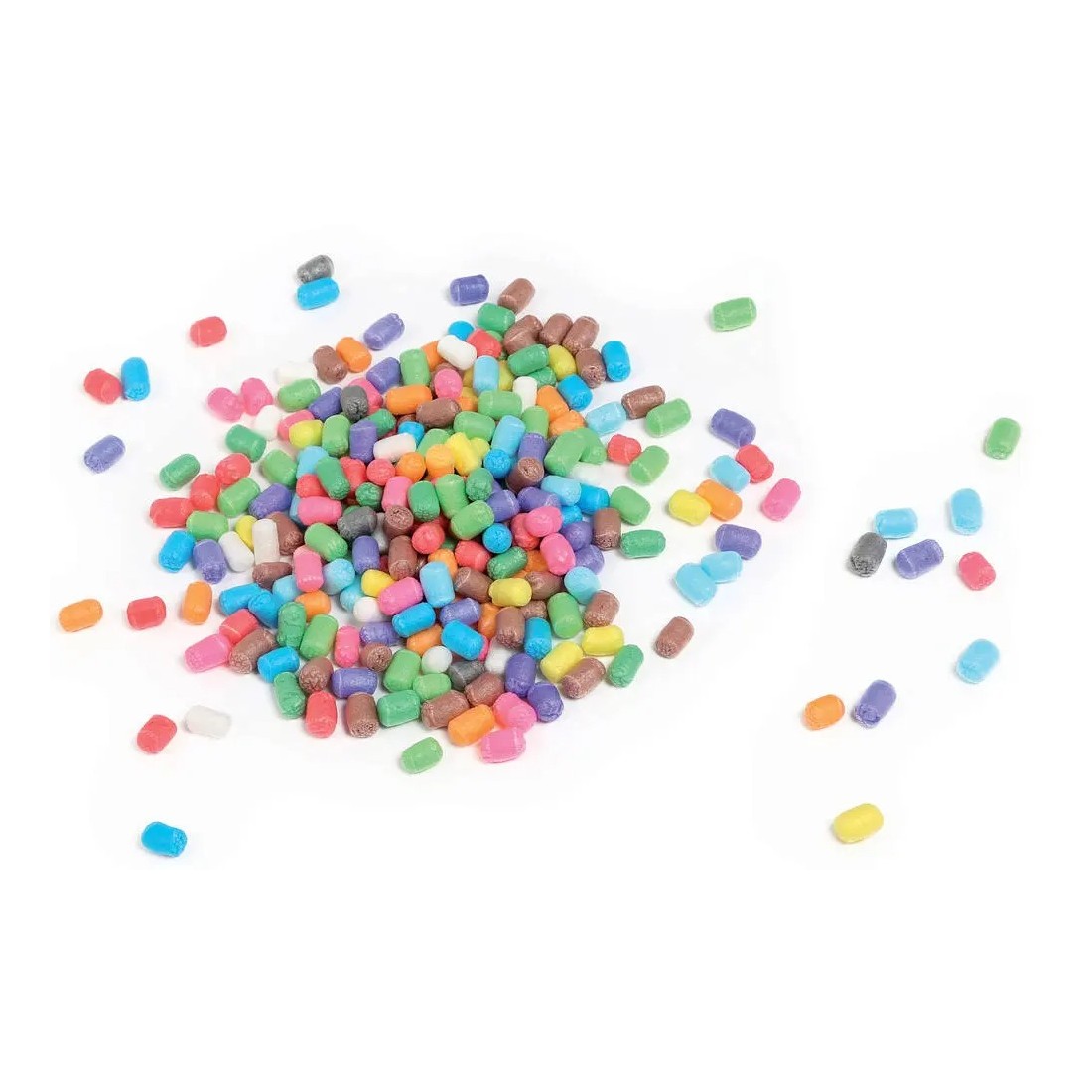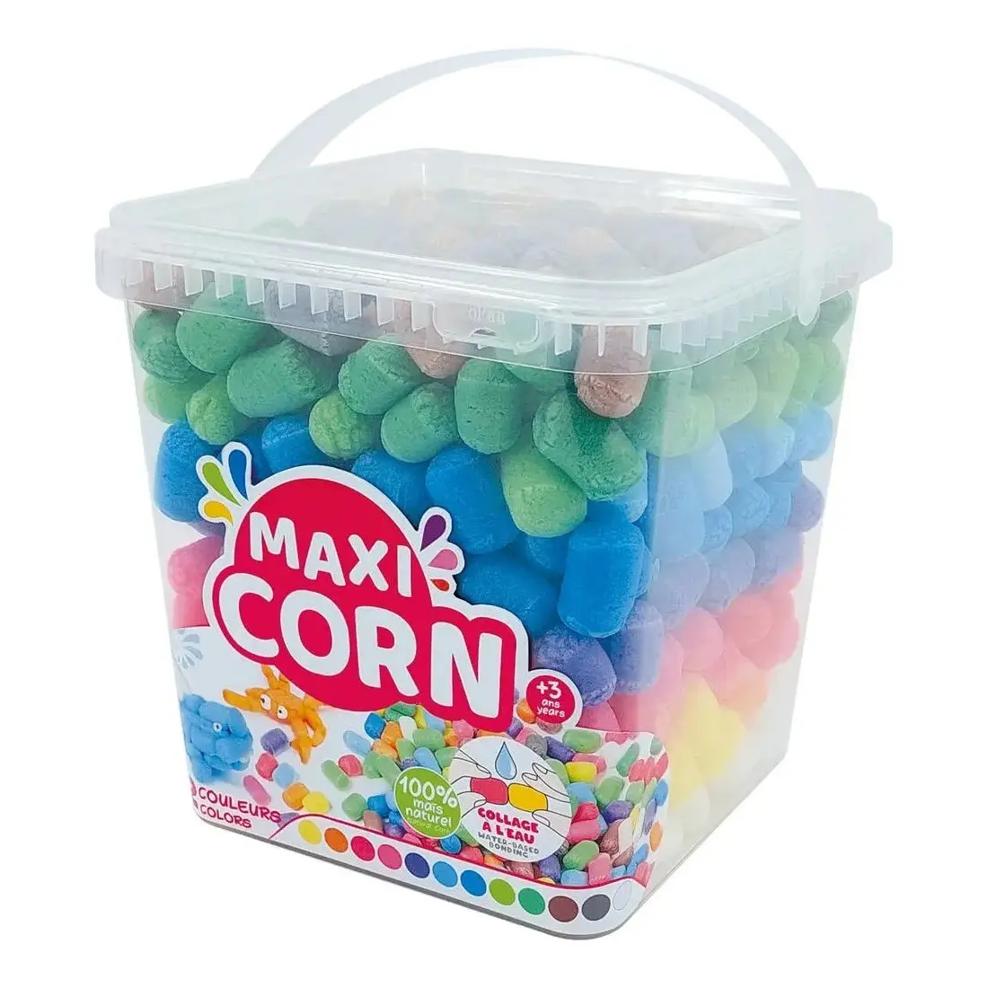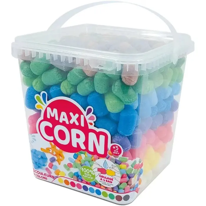 Les maxi corn sont des flocons multicolores, 100% biodégradable, constitués de maïs naturel, d’eau et de colorants alimentaires. Humidifiez une face du flocon, l’amidon du maïs ressort et sert de colle en séchant. Les flocons de maïs collent sur le papier, le carton, le polystyrène et sur toutes surfaces lisses.