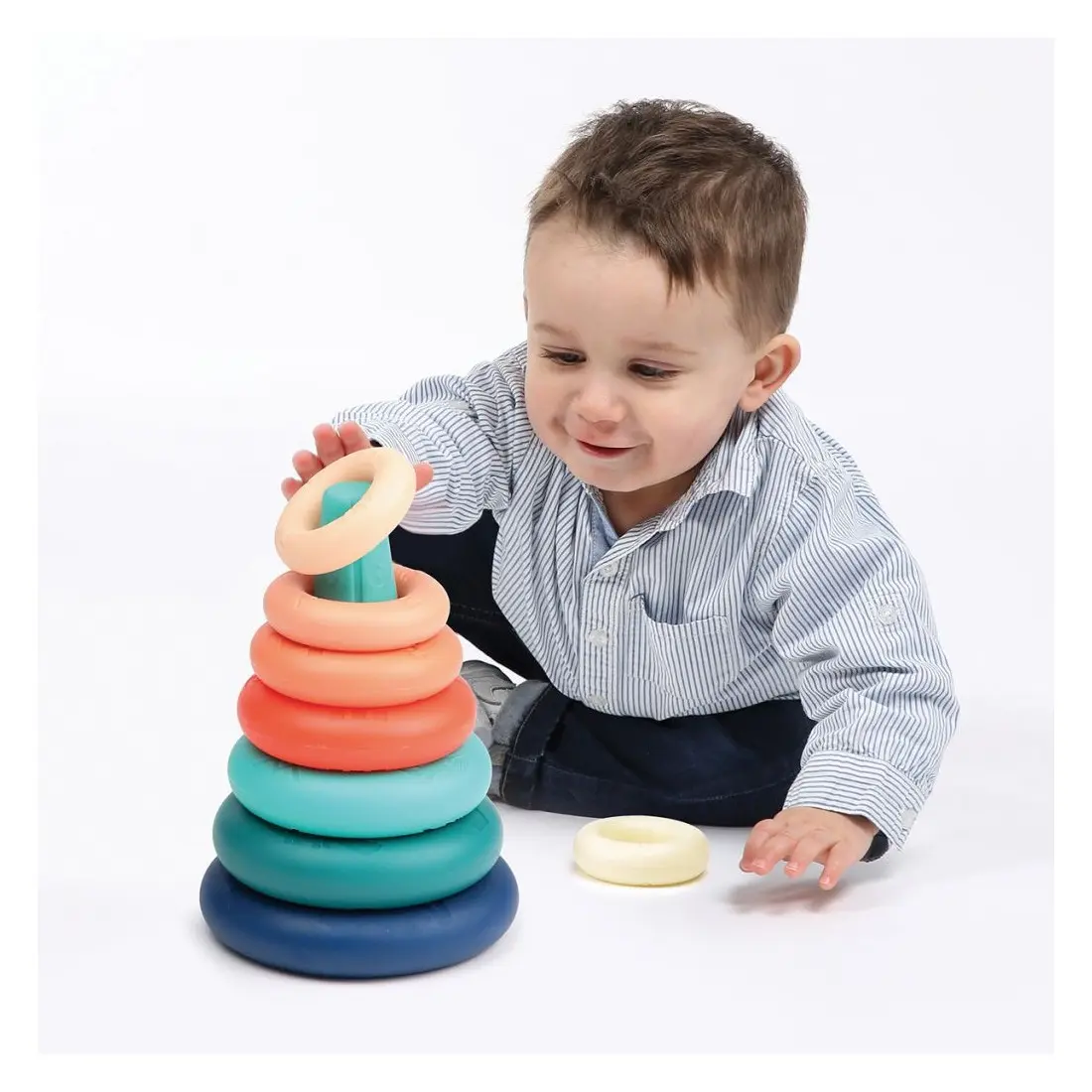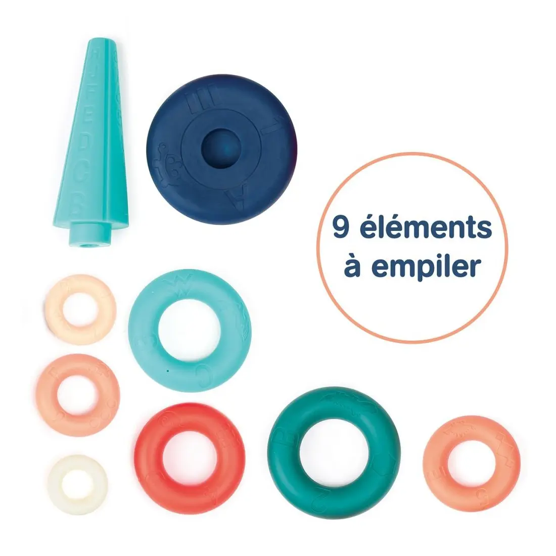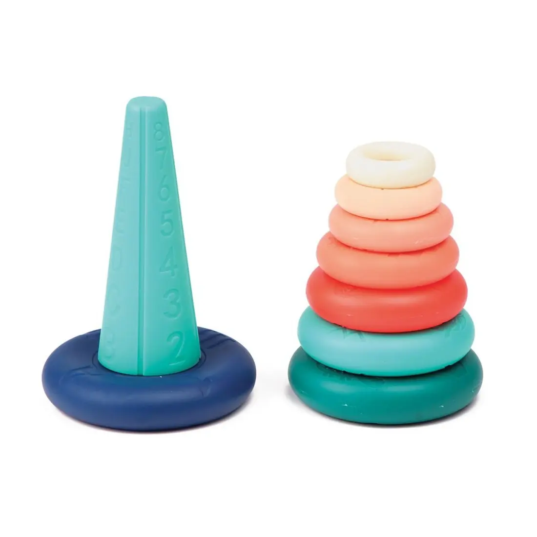 Les enfants pourront les porter à la bouche, la matière résiste aisément aux petites dents et se lave très facilement avec un chiffon humide. Les 8 anneaux s’empilent par rang de taille.