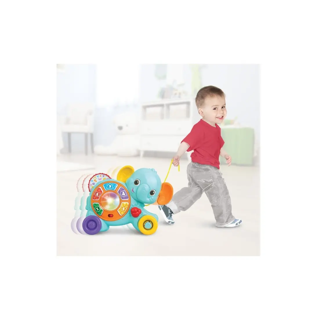 Voici un éléphant amusant qui peut accompagner votre bébé dès ses 6 mois, il pourra jouer avec en étant assis en appuyant sur les boutons et jouer de la musique. Comme il peut jouer avec debout, en tirant l'éléphant et en marchant avec lui.