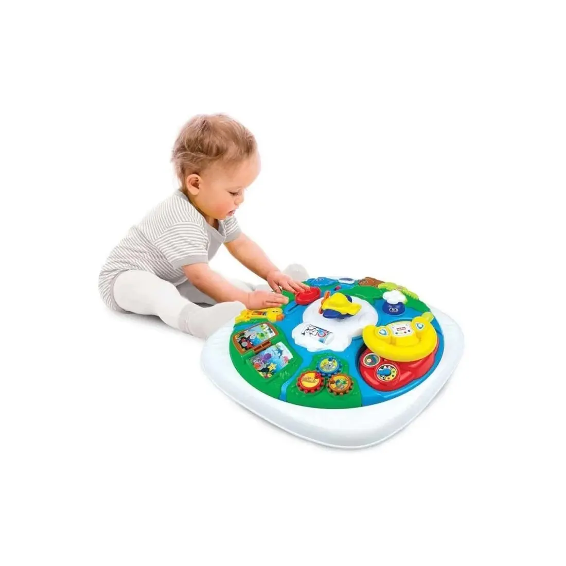 Partez à l’aventure autour du monde avec la table d’activités Globetrotter de Winfun. Votre bébé découvrira des phrases amusantes et effets sonores : Tournez le volant pour faire entendre l’avion, zoomez sur les nuages, appuiez sur les boutons lumineux et tournez la page du livre.