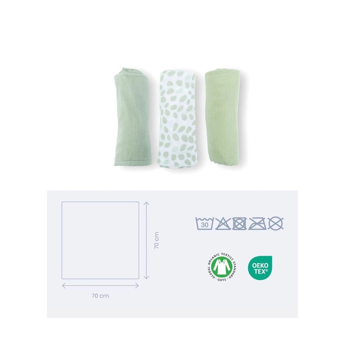 Doomoo Set de 3 langes Muslin 70x70 cm Mini Leaves Green.