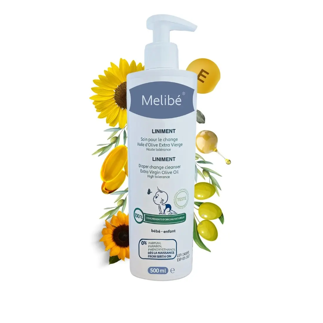 La gamme Melibé se compose de : Lait de toilette 200 ml & 500 ml, Shampoing bébé 200 ml, Gel lavant doux 500 ml, Liniment 500 ml, Huile corps bébé 200 ml, et Créme de change 100 ml.