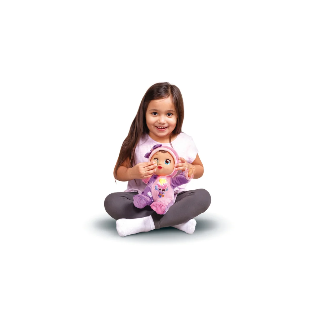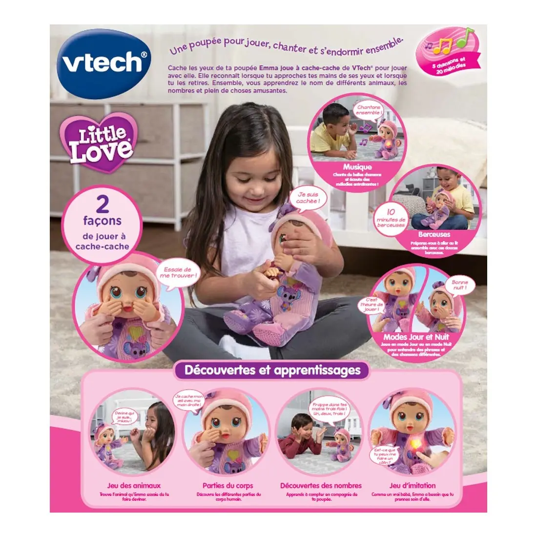 Découvrez Emma, nouvelle poupée Little Love. Votre enfant cache les yeux de sa poupée Emma joue à cache-cache pour jouer avec elle. Elle reconnaît lorsqu'il approche ses mains de ses yeux et lorsqu'il les retire ! Avec elle, votre enfant apprend le nom de différents animaux, les nombres et plein de choses amusantes.
