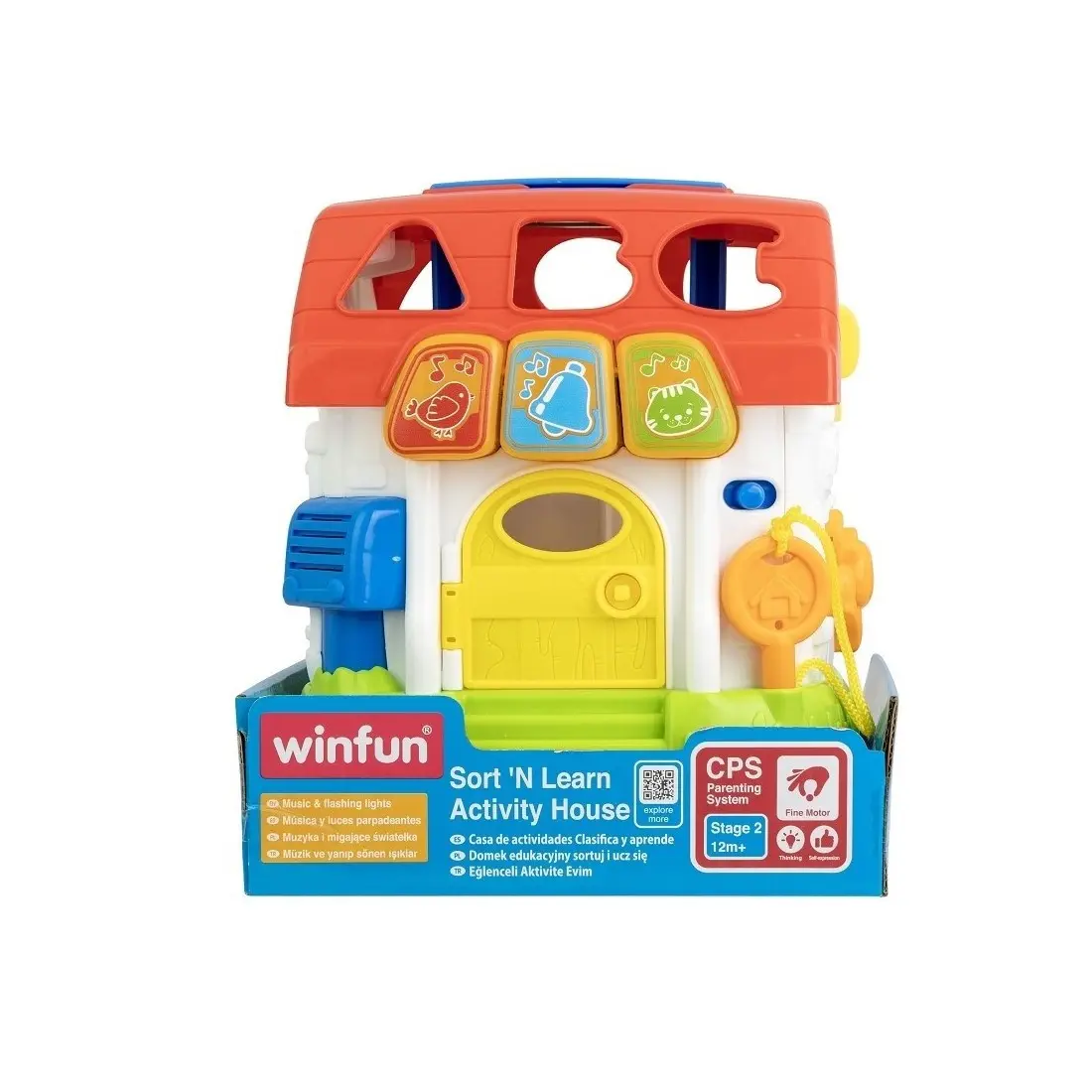 Winfun propose cette maison colorée pour bébés à partir d'un an, composée de 6 blocs de tri colorés. Elle contient 2 modes de jeu : Sons amusants et Jouez avec des morceaux. La clé facile à saisir verrouille et déverrouille la porte, pour un jeu d'imitation amusant.