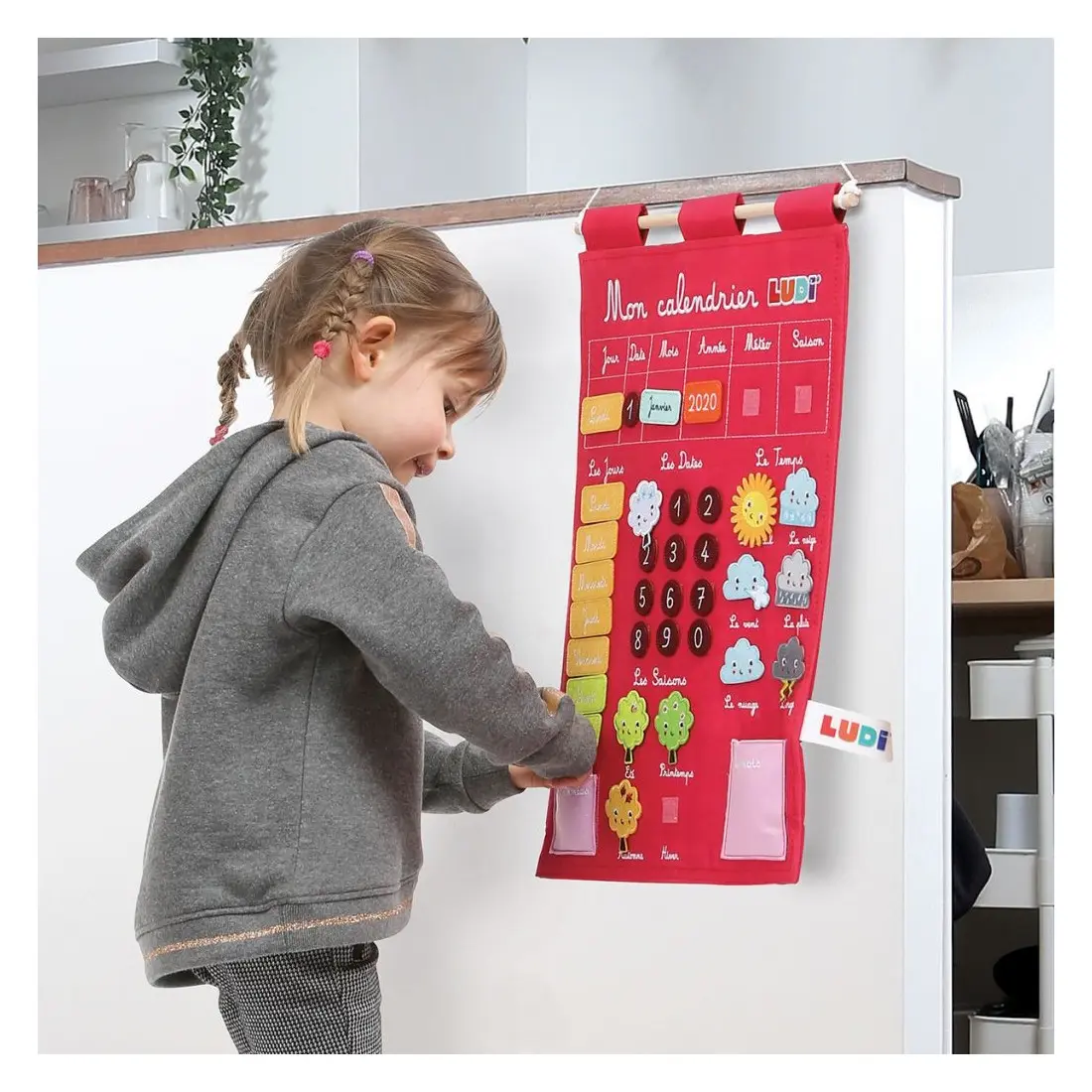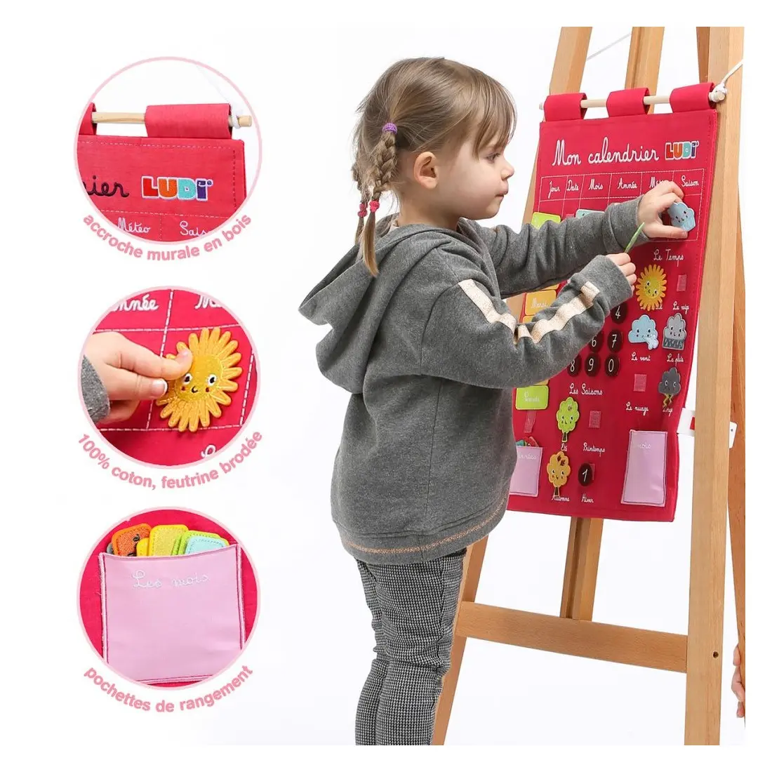 Un calendrier astucieux Ce panneau calendrier en tissu brodé, est spécialement conçu pour être accroché au mur avec sa baguette en bois. Les étiquettes amovibles en scratch sont faciles à manipuler pour les petites mains.