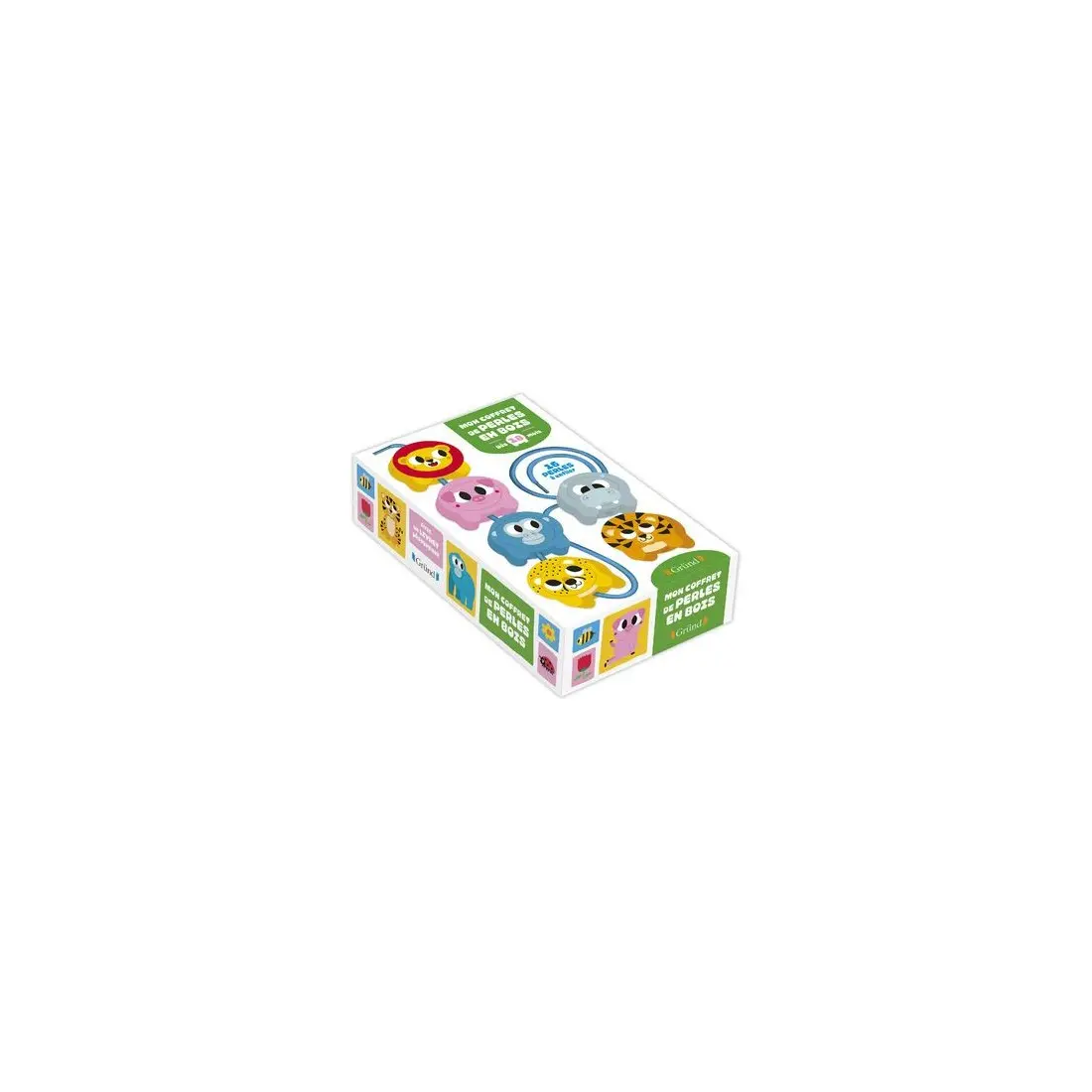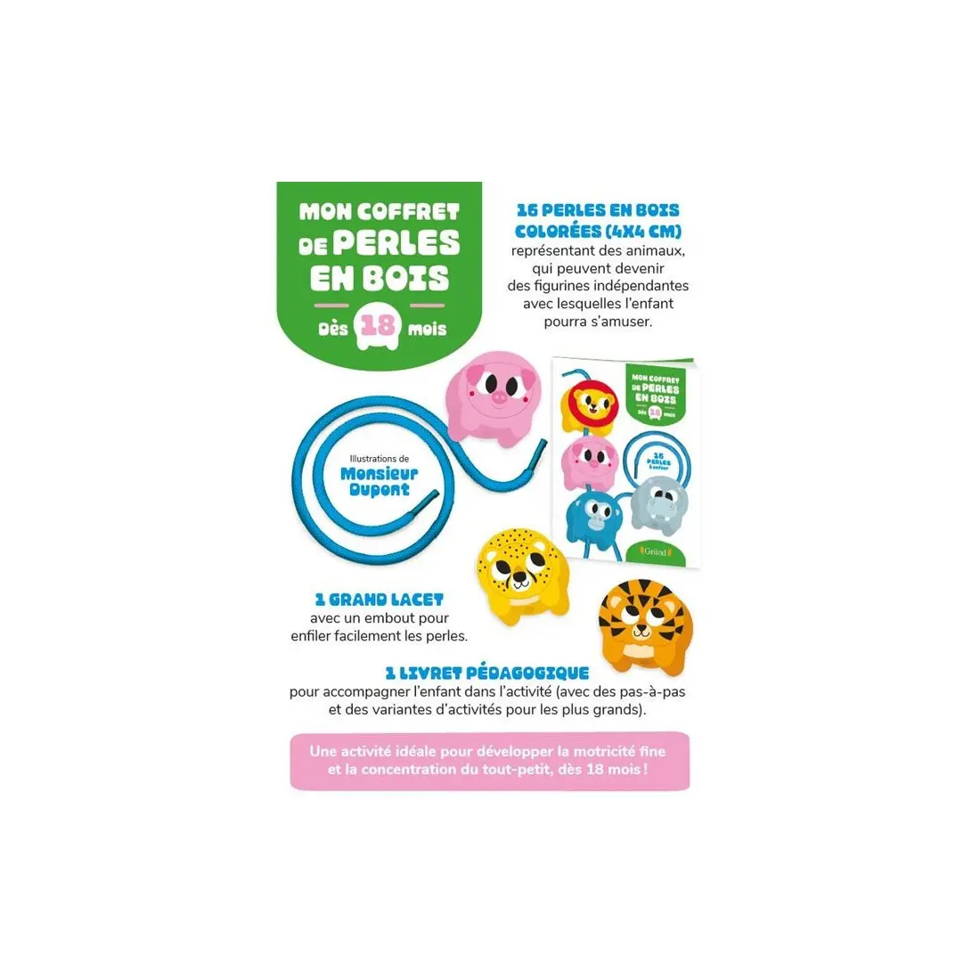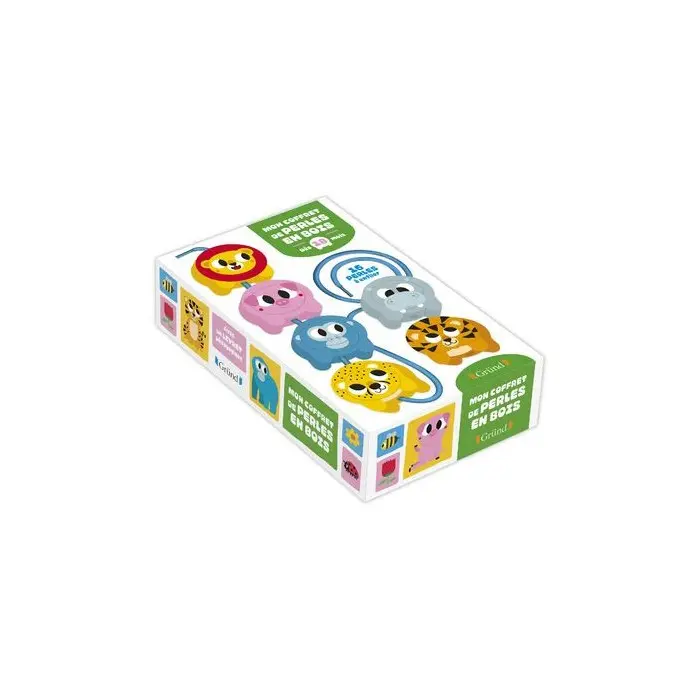 Mon coffret de perles en bois 18m +. Des perles en bois animaux à enfiler pour les petits dès 18 mois ! Ce coffret contient 16 grandes perles en bois colorées représentant des animaux, un grand lacet et un livret pédagogique. L'enfant doit enfiler les perles en bois sur un grand lacet (avec un embout pour enfiler facilement les éléments) pour créer une farandole d'animaux. Ces animaux peuvent devenir des figurines indépendantes avec lesquelles l'enfant pourra s'amuser, et inventer des histoires. Le livret pédagogique permet d'accompagner l'enfant dans l'activité en proposant des alternatives pour les plus grands (par exemple, d'enfiler les perles dans un certain ordre, ou de ranger les animaux par couleur). Une activité idéale pour développer la motricité fine et la concentration du tout-petit.