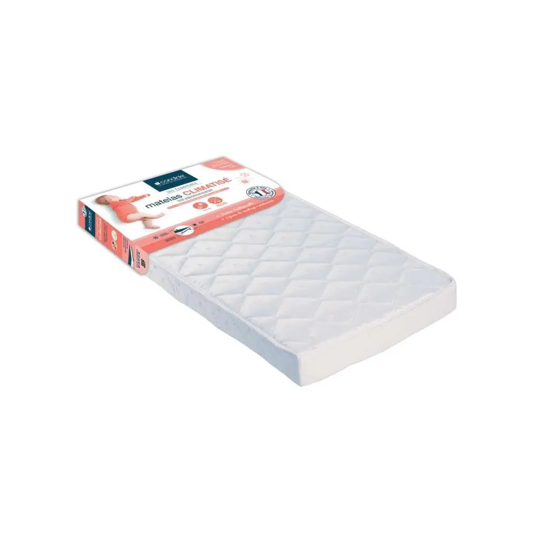 Mousse confort densité 20kg/m³. Sans traitement. Une face hiver ouatinée, une face été plus légère en polycoton. Une bande "Face hiver" cousue sur le matelas pour identifier facilement les faces de couchage. Anti-acariens et anti-bactérien.