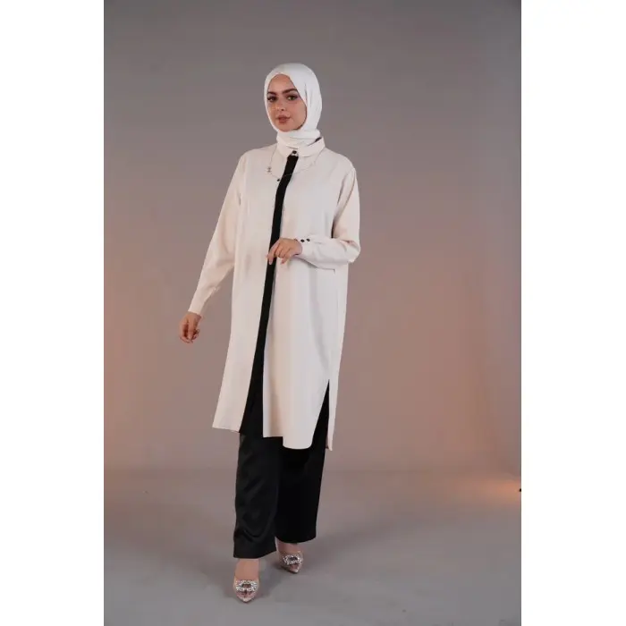 Sa coupe longue et droite assure une silhouette moderne et couvrante, tandis que les fentes latérales apportent confort et liberté de mouvement. La fermeture à boutons dissimulés sur le devant et les poignets boutonnés ajoutent une finition raffinée et minimaliste.