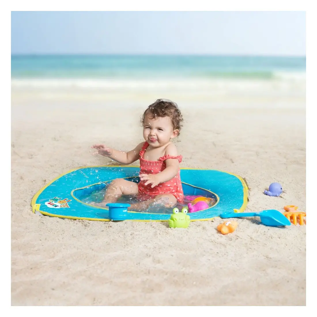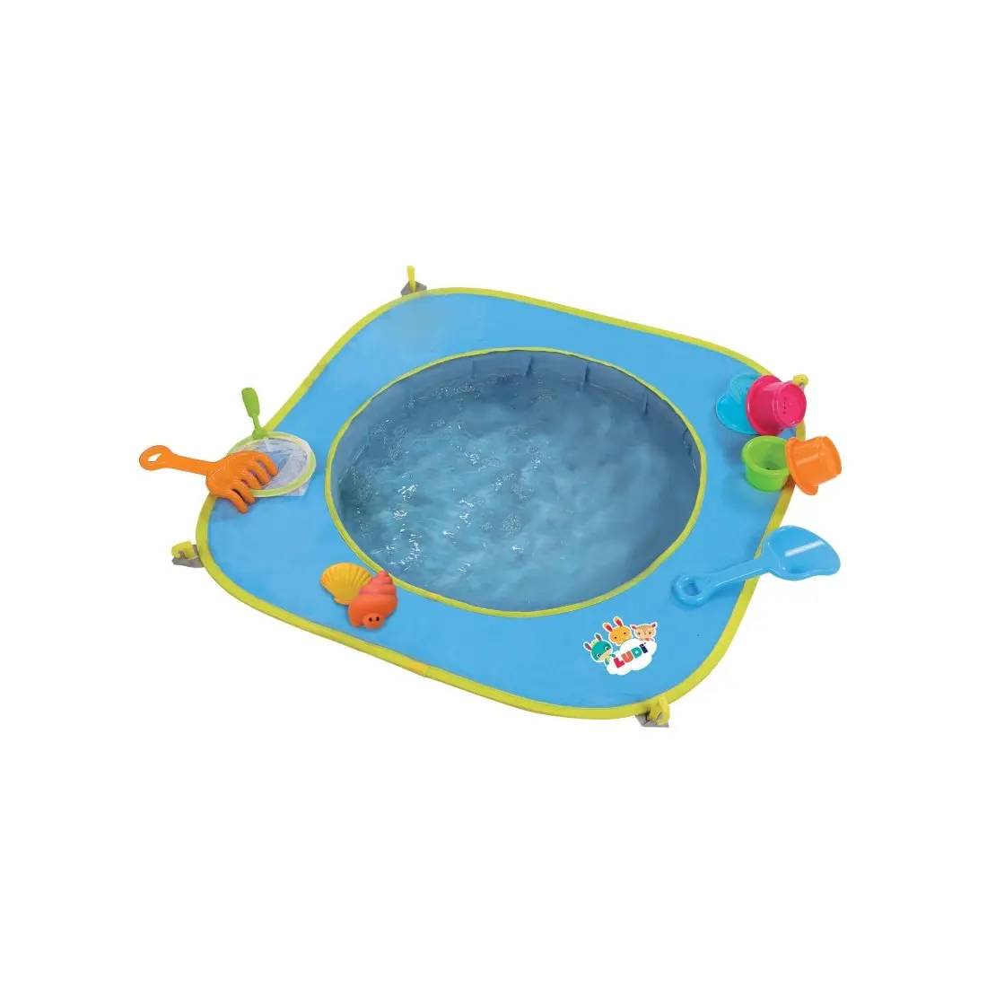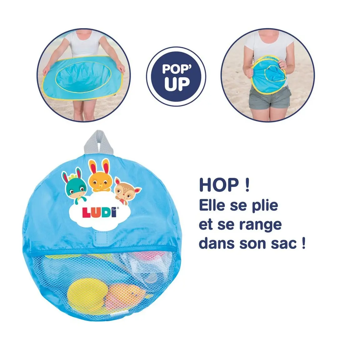 Ludi propose cette piscine pratique pour jouer sur la plage. Fournie avec 9 jouets de plages et 1 sac de transport ! Pop-up, elle est légère, peu encombrante et se range dans un sac de transport.