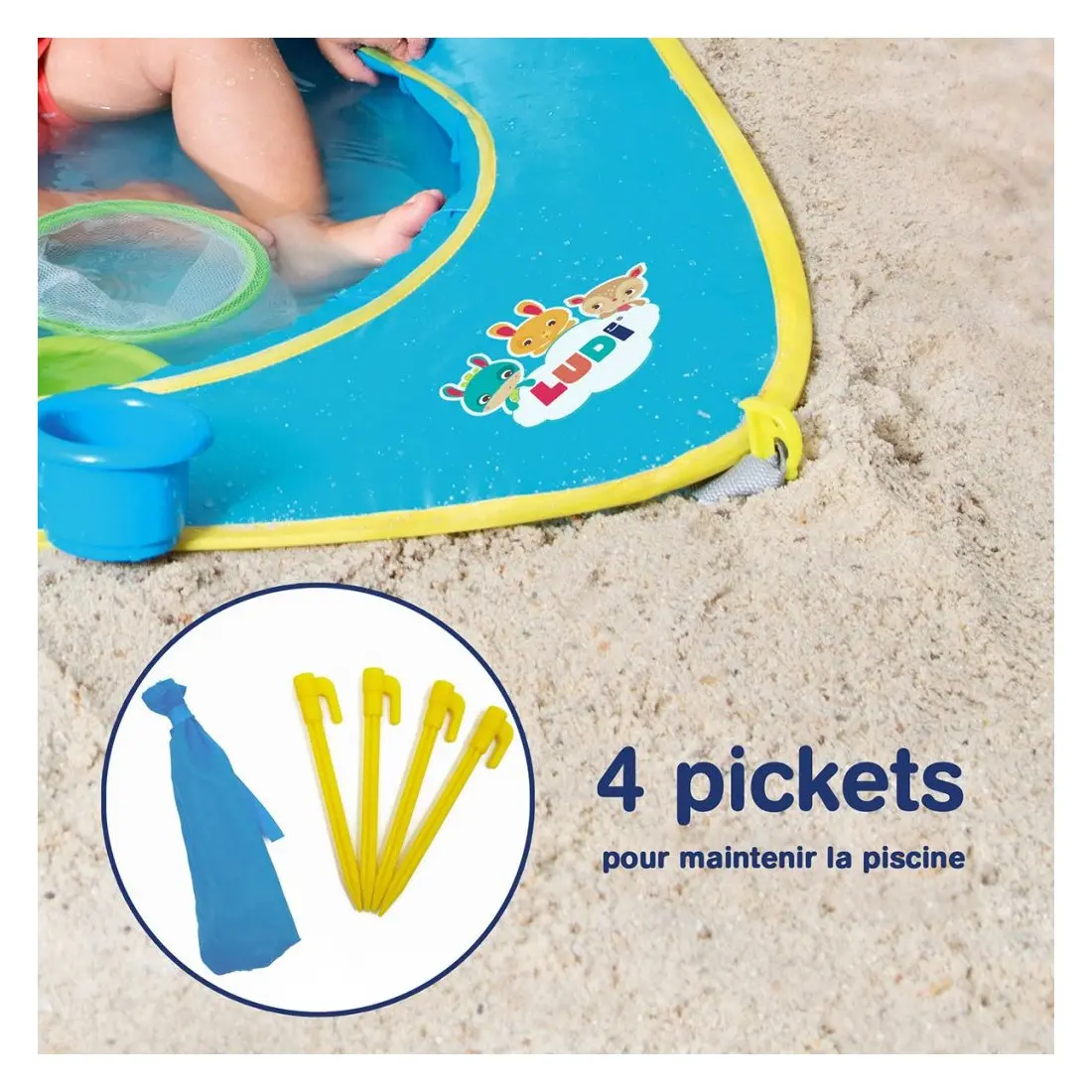 Vite installé et vite rangé, ce produit inédit est complété de 4 fixations au sol, de petits jouets de plage et accessoires ludiques : un râteau, une pelle, une épuisette, 4 moules perforés et 2 aspergeurs. Il est impossible de s’ennuyer ! Dans le sac, vous pourrez tout ranger ! Tout est pensé pour le confort de Bébé et celui de ses parents.