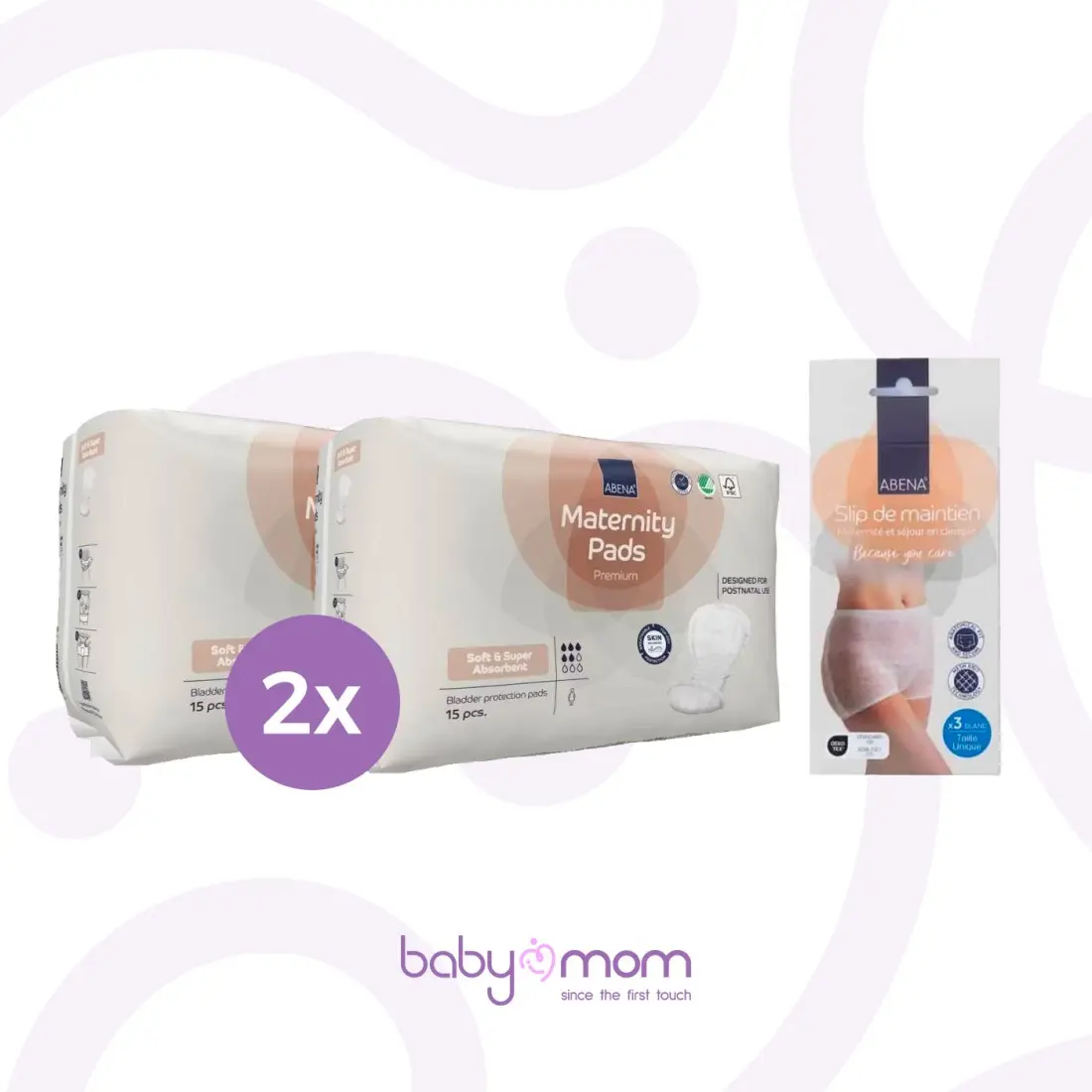 Contenu : deux packs de serviettes maternité Abena (15 unités x2) et un pack de slips jetables (3 unités).