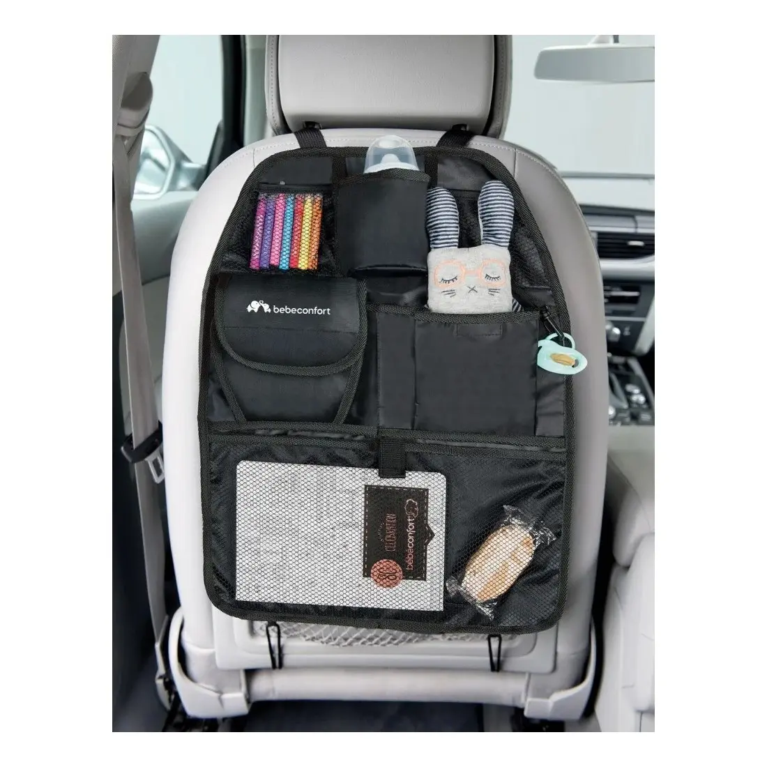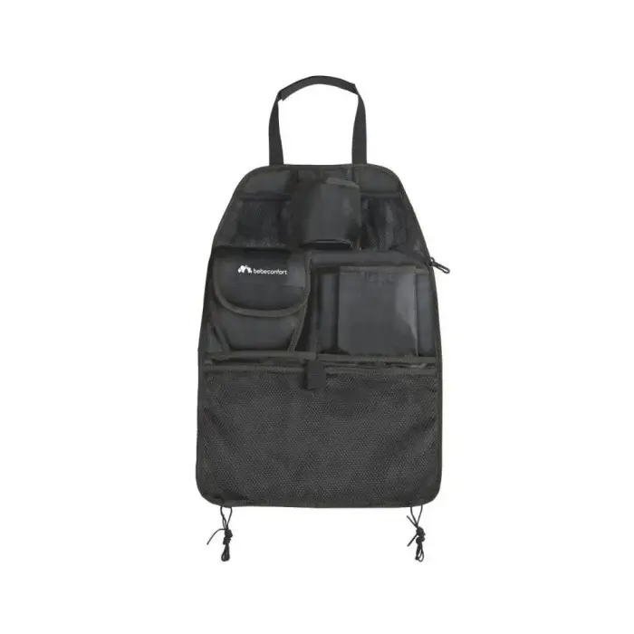 L'organiseur de siège Bebe Confort est pratique et permet d’optimisé votre rangement (porte-biberon/porte-bouteille, clip pour fixer la sucette, poches de différentes tailles etc). Il peut être installé dans tous les types de voitures et est lavable en machine à 30°C.