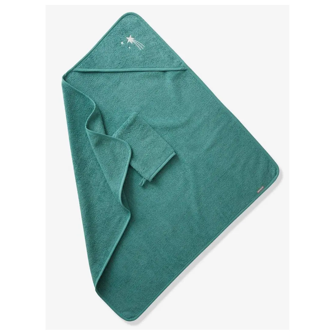 Motif brodé sur la capuche de la cape de bain et le gant de toilette