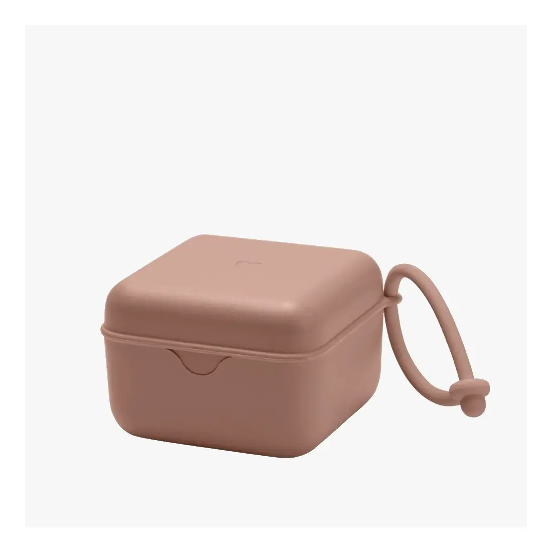 Il suffit de glisser la ou les tétines à l'intérieur, de fermer le couvercle et d'accrocher la boite au sac à langer ou à la poussette grâce au cordon en silicone.