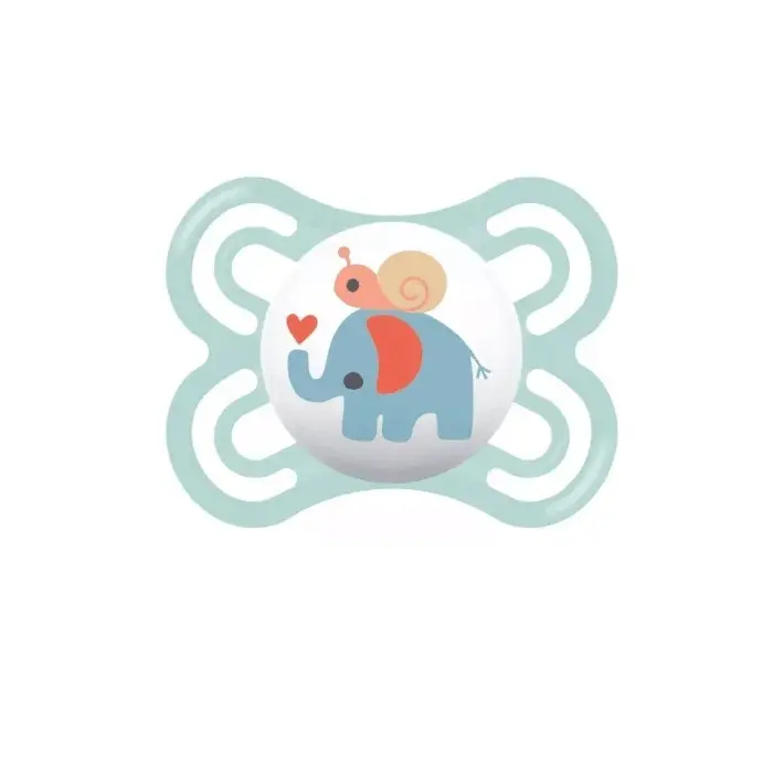 Forme symétrique toujours adaptée à la bouche de bébé. Mis au point en collaboration avec des dentistes pour favoriser le bon développement dentaire.