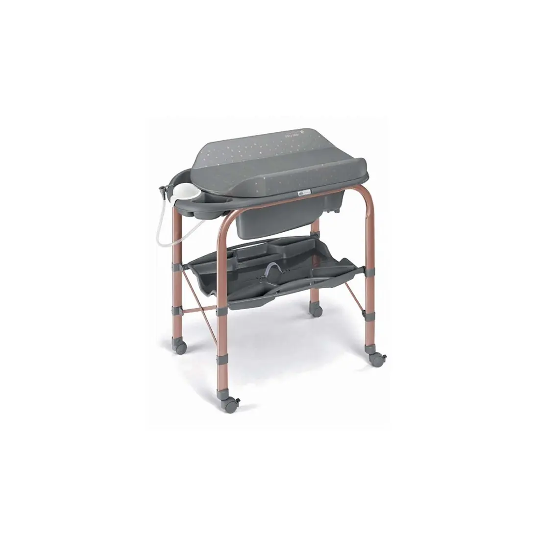 Table à langer avec système anti-basculement, équipée de la baignoire Baby Bagno avec 2 assises anatomiques et antidérapantes (une inclinée pour les bébés de 0 à 6 mois et une assise avec accoudoirs pour les bébés de 6 à 12 mois), avec espaces porte-savon et porte-éponge, petite douche, bouchon et tuyau pour l’évacuation de l’eau, tiroir porte-objets avec porte-flacons, 4 roues dont 2 avec frein.