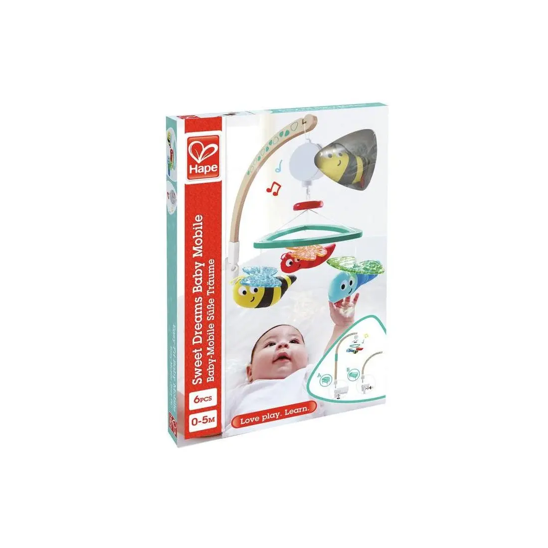 Ce mobile Hape comprend une boîte à musique qui joue une comptine et fait tourner le mobile.