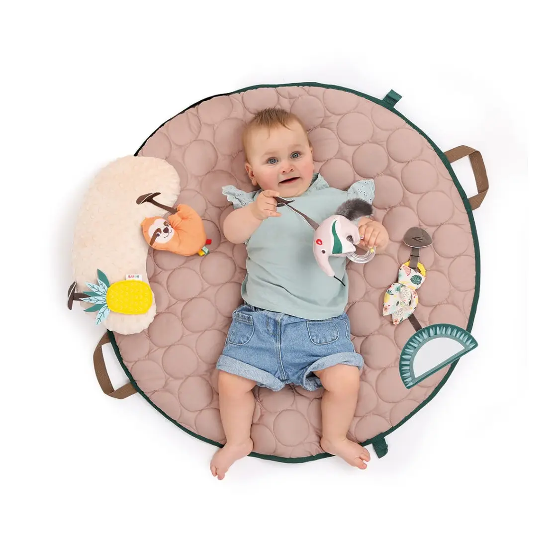 Dès la naissance : Bébé s’allonge confortablement et découvre les jouets suspendus, stimulant sa vue et sa préhension. Grâce aux 9 points d’accroche, les activités sont interchangeables pour une exploration variée.