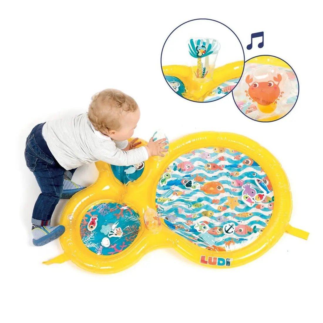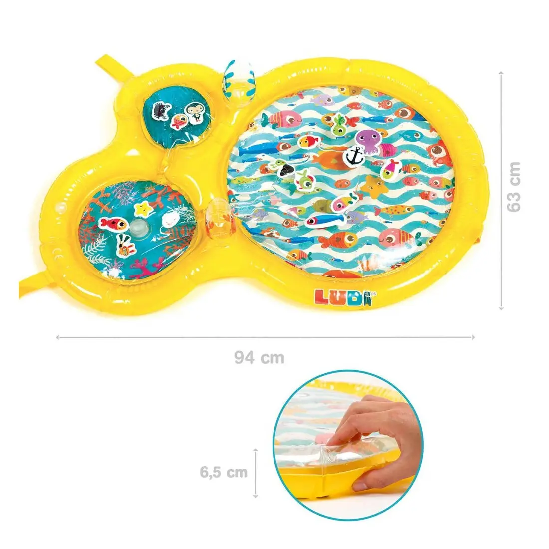 Le Maxi Tapis d’eau LUDI plonge les enfants au cœur d’un monde aquatique ! A travers les trois hublots, bébé admirera des univers marins où vivent des mollusques, des poissons, un pingouin, un crabe, une étoile de mer et une tortue. Il fera également la rencontre d’un petit plongeur courageux partant à l’aventure pour s’approcher des animaux et contempler les fonds marins.