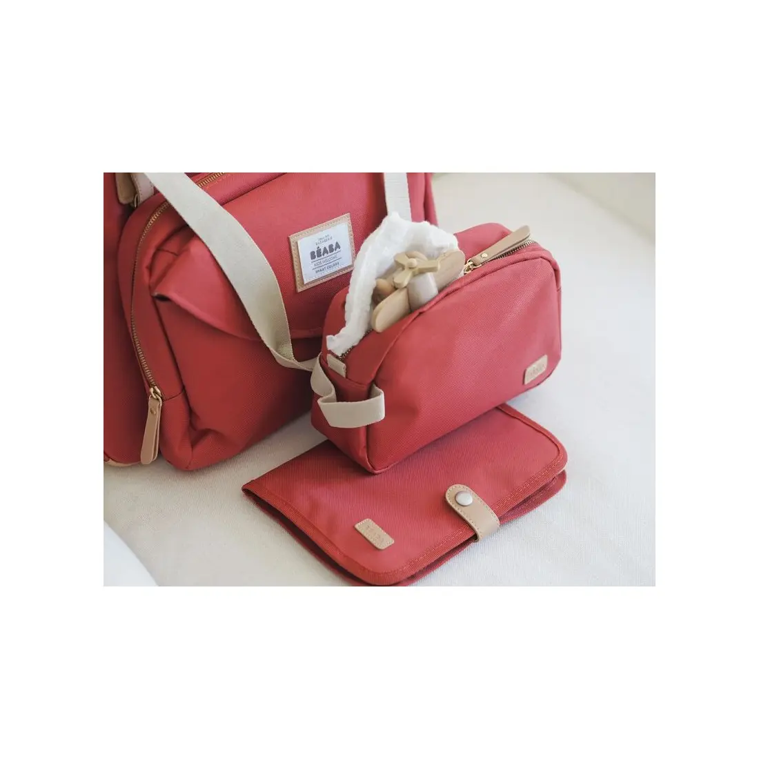 Béaba propose cette belle trousse de toilette (vide) pratique, qui permet de ranger le nécessaire de toilette de bébé lors des voyages