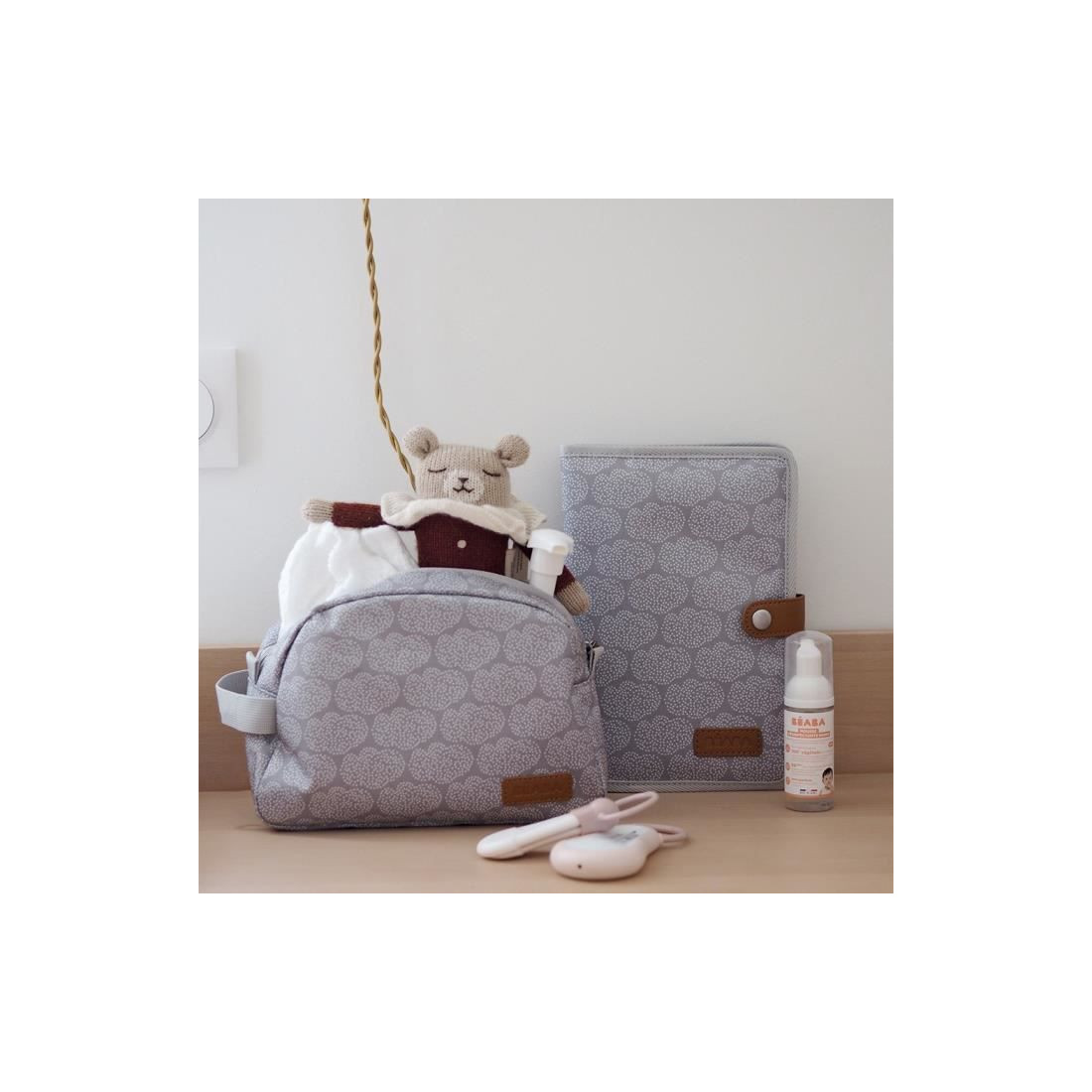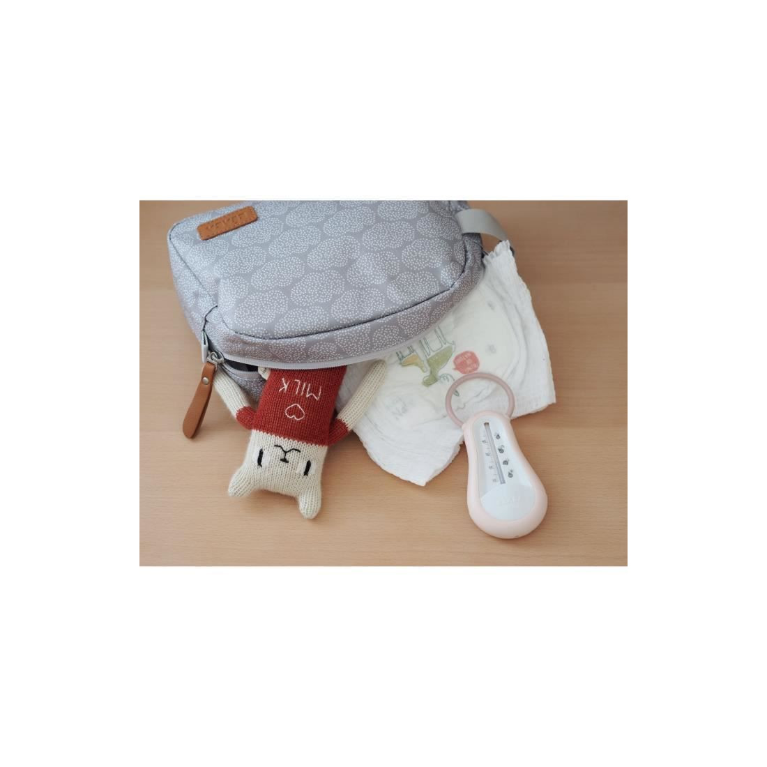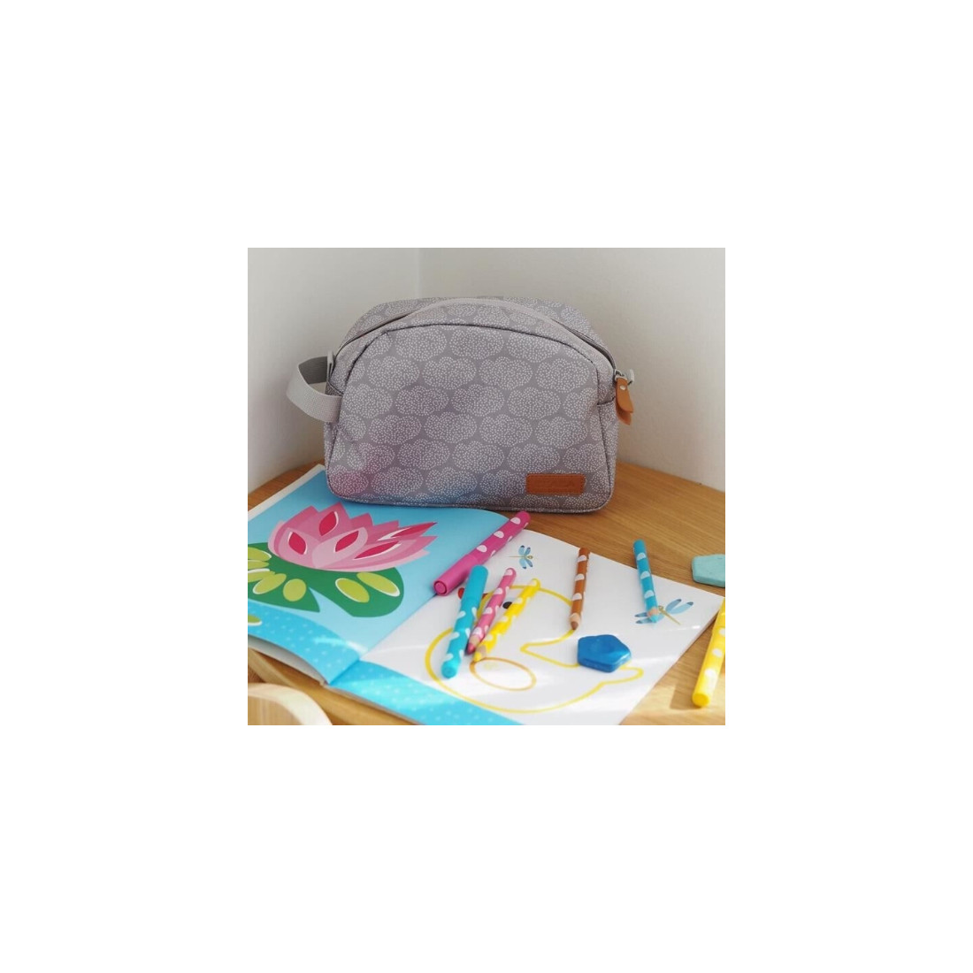 Béaba propose cette belle trousse de toilette (vide) pratique, qui permet de ranger le nécessaire de toilette de bébé lors des voyages