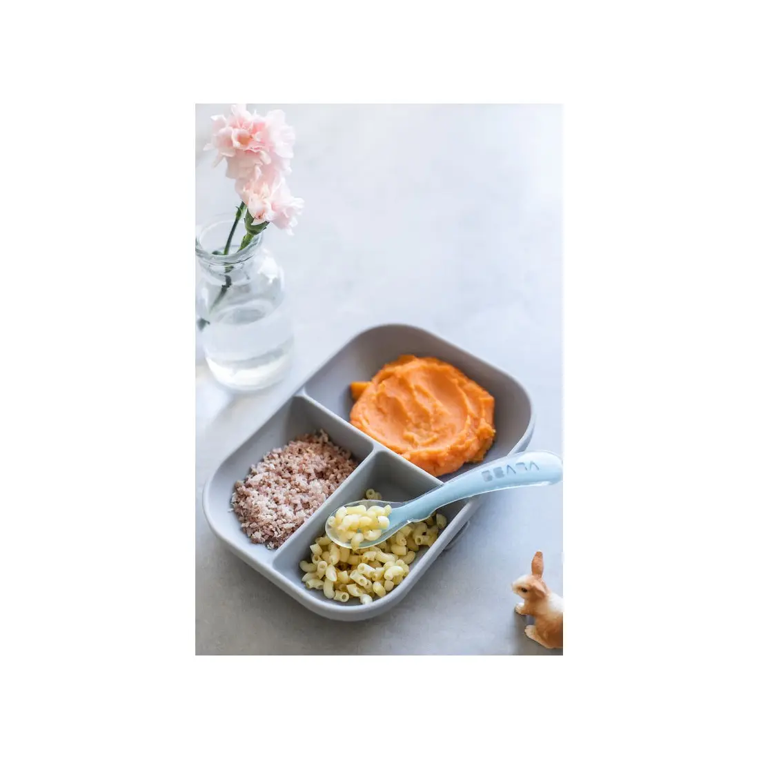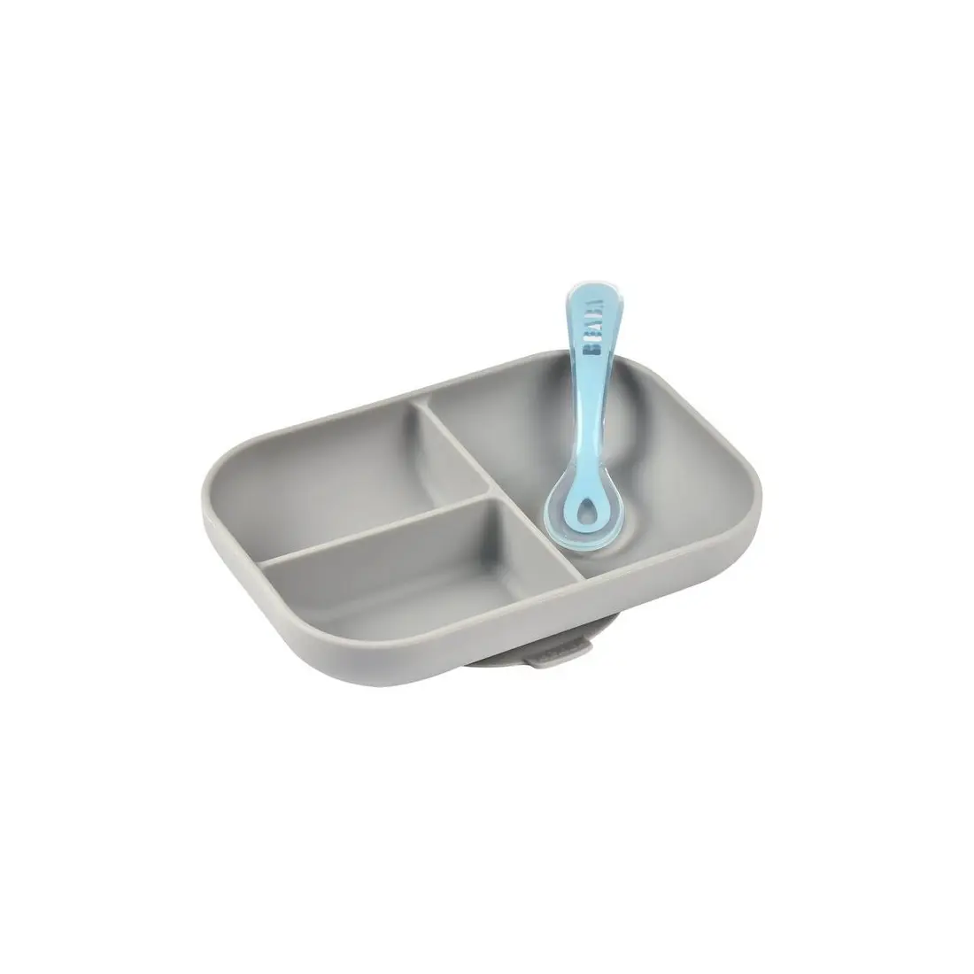 Set repas gris Béaba avec ventouse et compartiments pour apprendre à bébé à manger seul sans faire tomber son assiette. Livré avec une cuillère d’apprentissage.