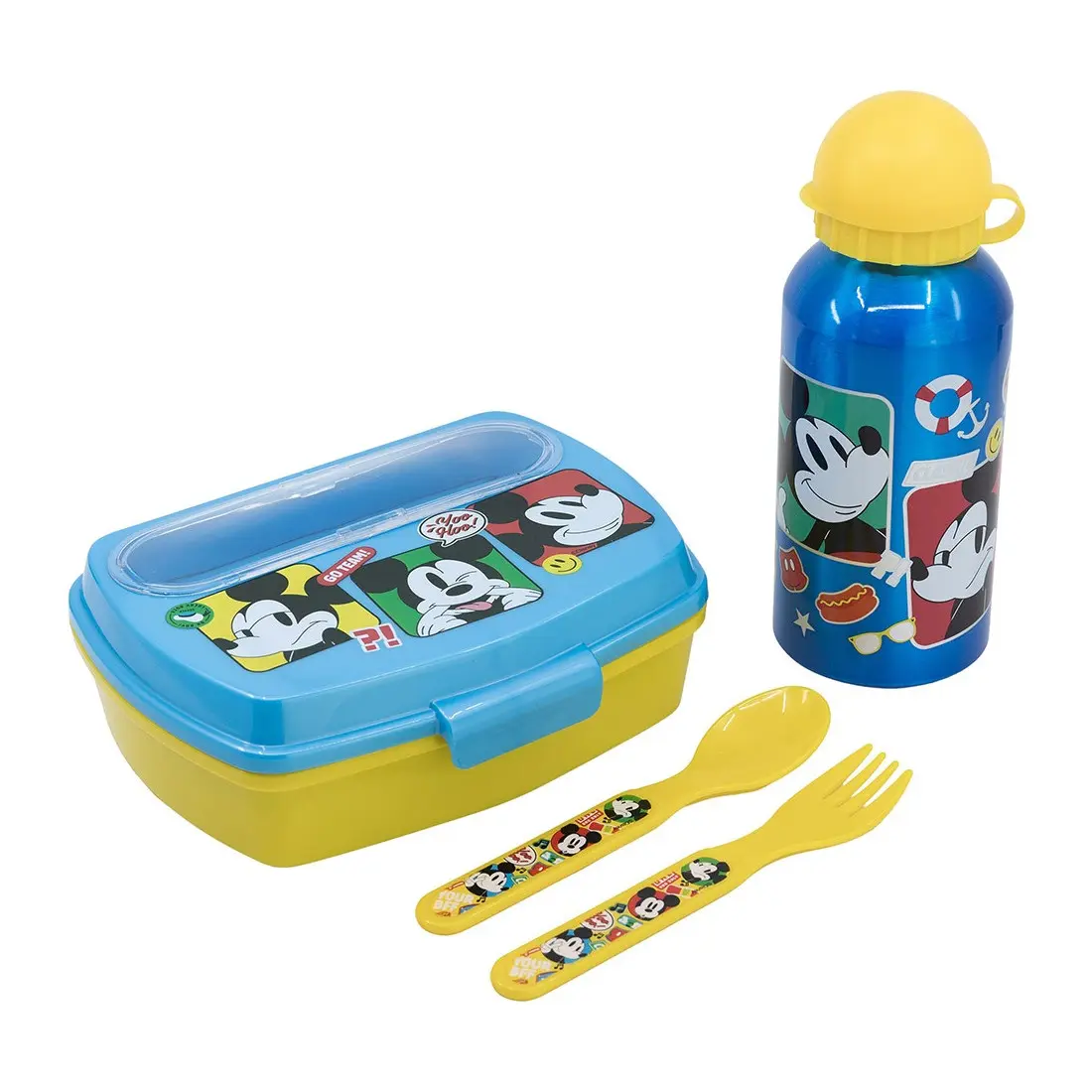 Lunch box + Couverts + Gourde en inox Mickey Mouse.